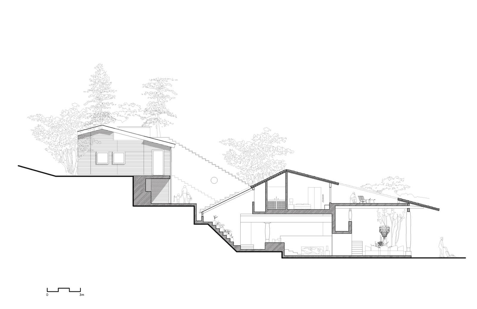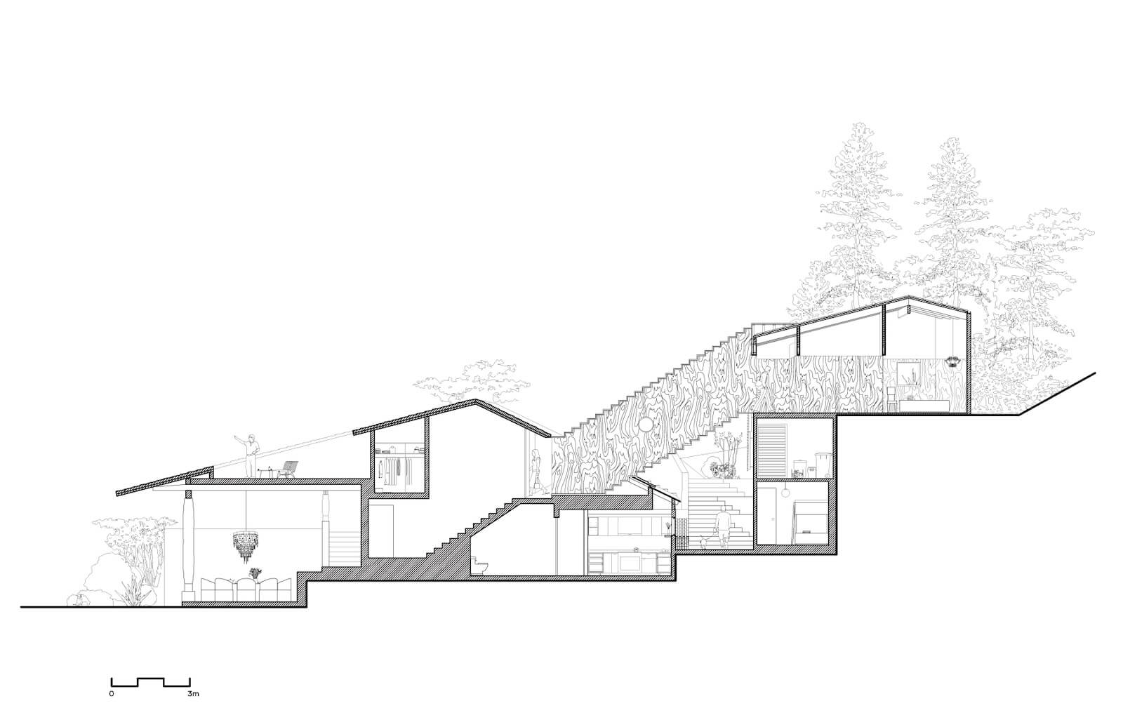 Near the edge of a lake in Valle de Bravo, Mexico, a house has been expanded in an expressive language that speaks of joyful adaptation. A serrated stair volume now connects the existing volume to an addition carved into the mountain just above it. “A staircase breaks through the roof, eager to extend upward,” the architects, Pedro&Juana, explain in their poetic project description. “The house turns around and discovers a previously overlooked backside, opening up to new outlooks on the lush surrounding nature. Suddenly, life celebrates life itself.”
