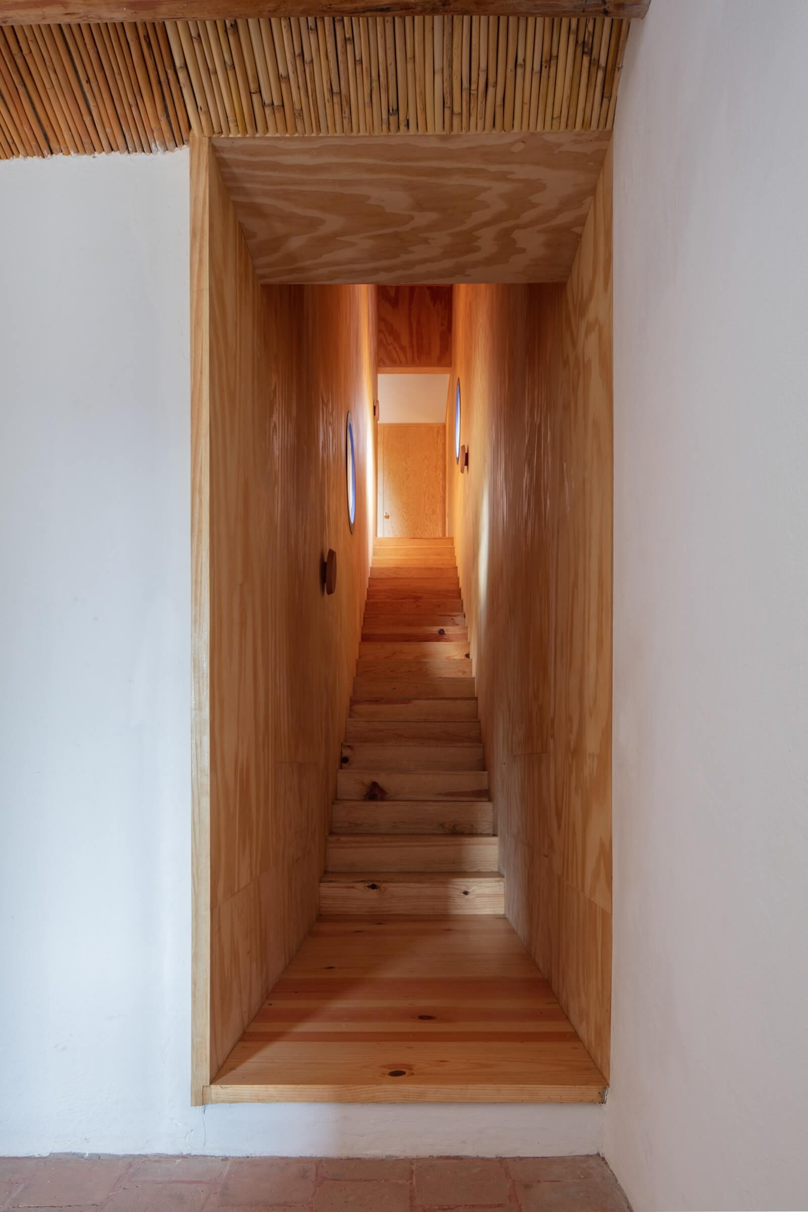 The serrated stair volume is a central feature of the Valle de Bravo home’s expansion, where it connects the existing home with a new annex.