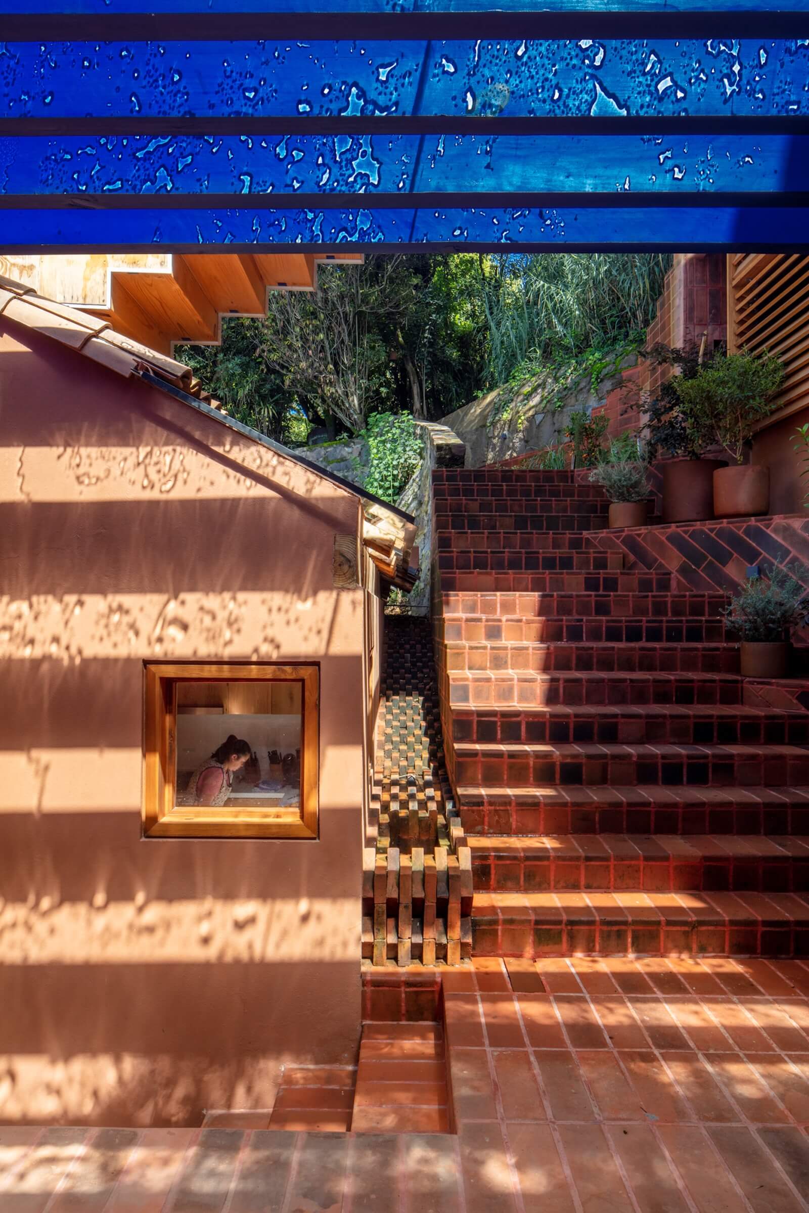 The two halves of the home are connected by more than that one stair volume, which links their interiors: Terracotta brick staircases also knit them together, indoors and out, as do shared patios. On the building’s exterior, a gap between the brick stair and the existing home is filled with a cascade of rotated blocks, a connective tissue that drives home the deft and considerate tapestry created by weaving together the various spaces as well as the materials that comprise them.