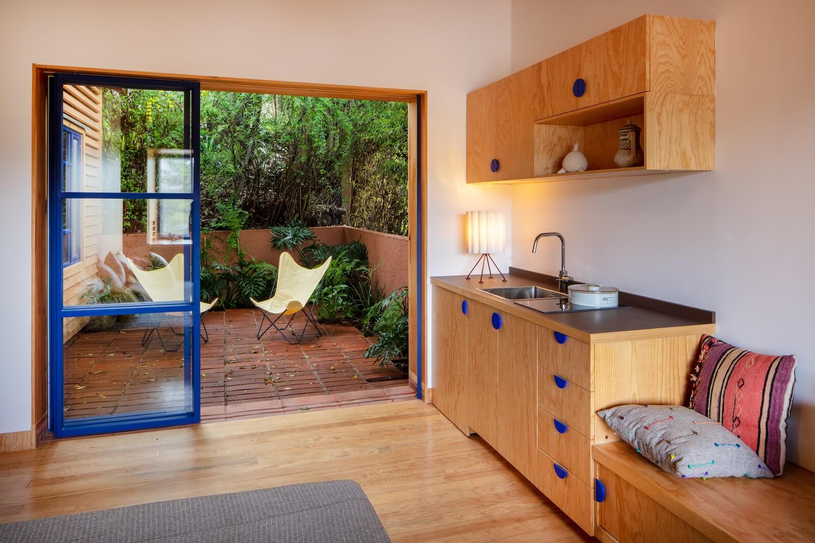 Perched at the top, the annex houses a bedroom and two bathrooms as well as a multitudinous space the architects call a “kitchen-slash-studio-slash-bedroom” that leads out to a patio.