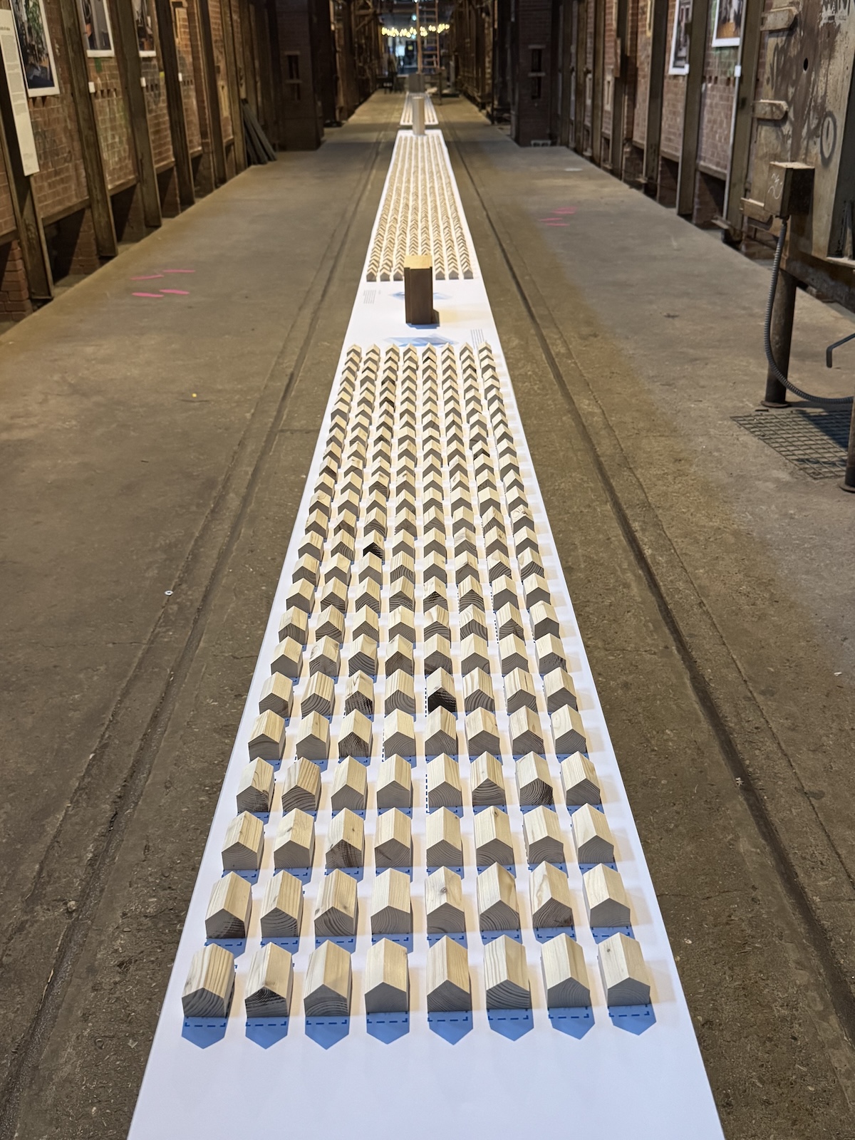 What does it mean for us in Toronto and North America? In terms of embodied carbon costs, the impetus to avoid demolition is just as urgent. Yet, our growing city also faces an acutely troubling paradigm. Accompanying To Build Law, Giaimo’s Houses Worth is a study of local development projects that aim to replace tall, densely populated 20th-century towers with even larger new housing. Scale models of threatened buildings are paired with hundreds of single-family homes, illustrating the cost of demolition by translating each imperilled high-rise into an equivalent carbon value of houses. In a sprawling, low-density city still dominated by single-family forms, it invites an urgent reconsideration of land use policy.