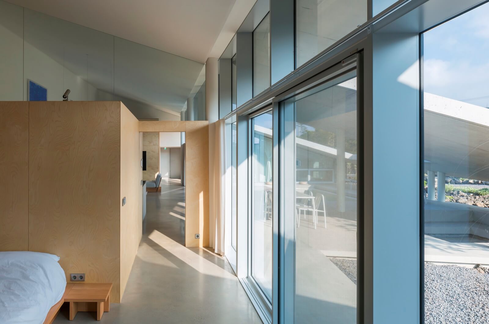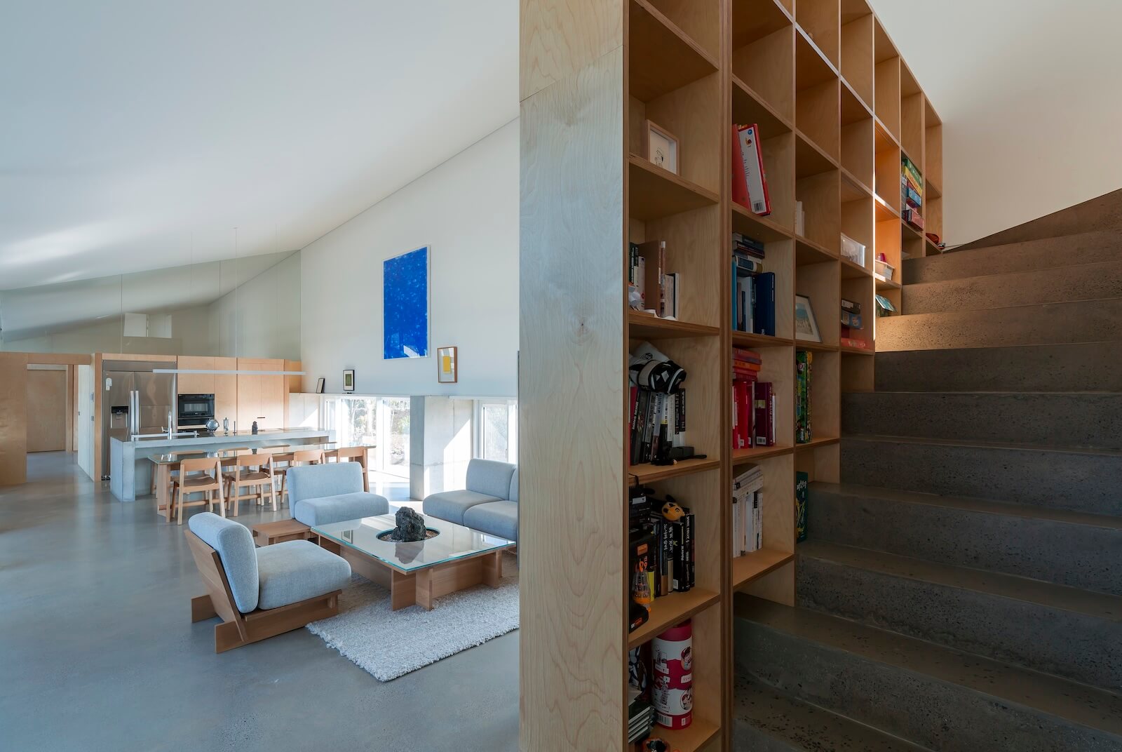 To that end, BCHO angled the roof — an almost heroic poured-concrete slab — so that it meets the ground. The 414-square-metre expanse forms a protected exterior zone with two large surface openings that frame the sky and the silhouette of Sanbangsan while also doubling as a climbable plane from which to enjoy the surrounding sights from an exhilaratingly uncommon viewpoint. Inside and along the courtyard perimeter, the kitchen and living room sit at the centre of the plan, flanked by the main bedroom, while the children’s rooms and the guest room hug the home’s western edge. All the spaces also enjoy exposure on the south side via a long band of glazing. The result is a one-stroke house that draws in views from every part of the interior.