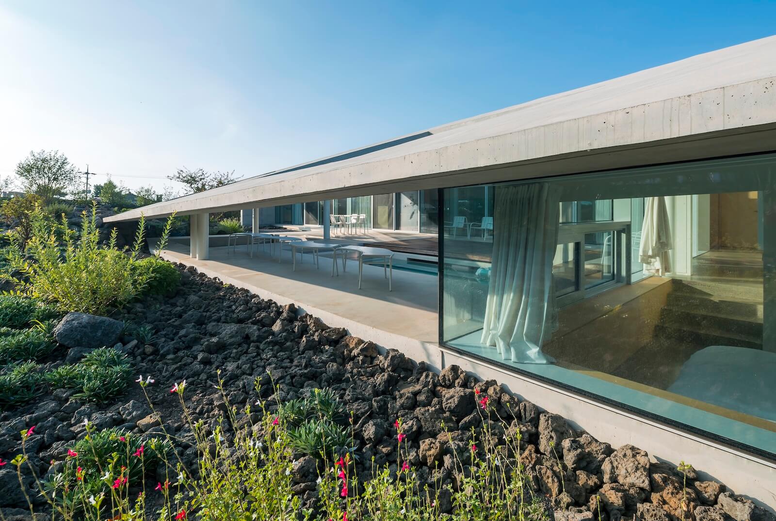 On Jeju island, with a view of Sanbangsan, Sloped Roof House is the latest and most daring courtyard-typology house by Byoung Cho and his Seoul-based BCHO Architects Associates.