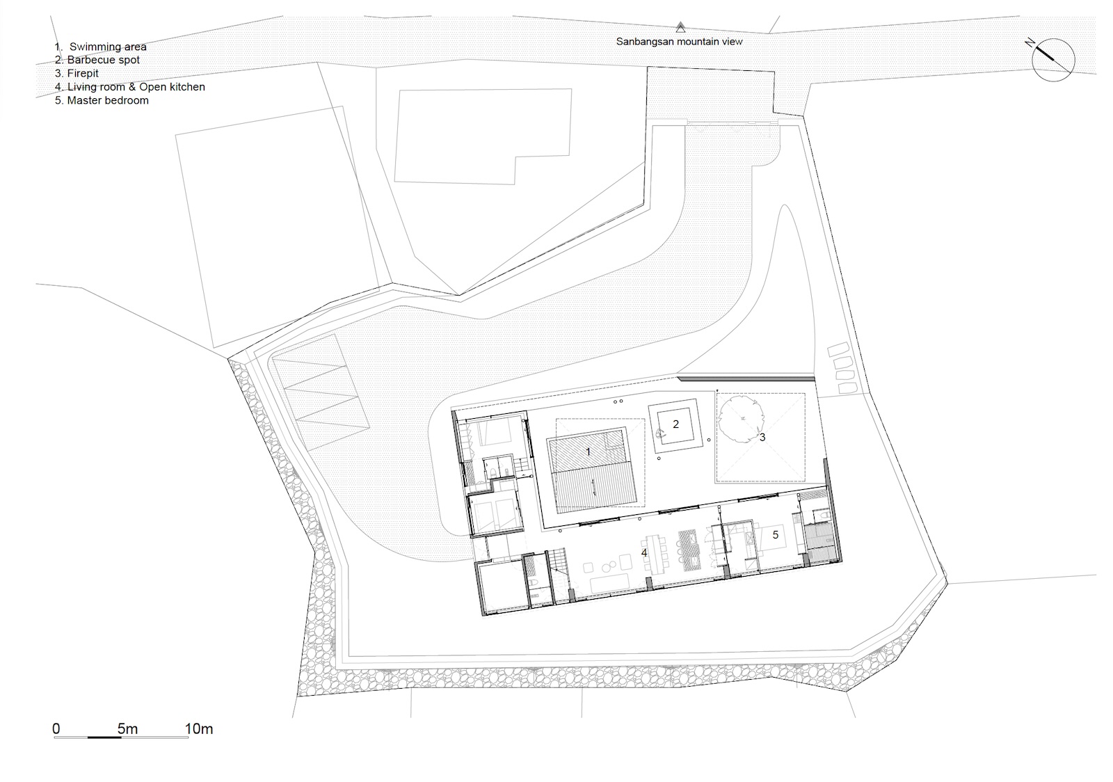 Beneath the sheltering roofline, there is a pool on one side for the children and a small firepit on the opposite; in the middle, a recessed place invites everyone to sit and rest. “When a building stretches horizontally, a roof that stays close to the ground feels more stable,” Cho says. His work has long emphasized how simple forms shape spatial experience, and he approached the design of this project by studying how the building should meet the terrain. Observing the natural flow of the land led to the decision to lower the roof until it touched the ground — a gesture that reduced its apparent scale while creating a functional shelter. The gentle roof slope was also informed by construction logic.