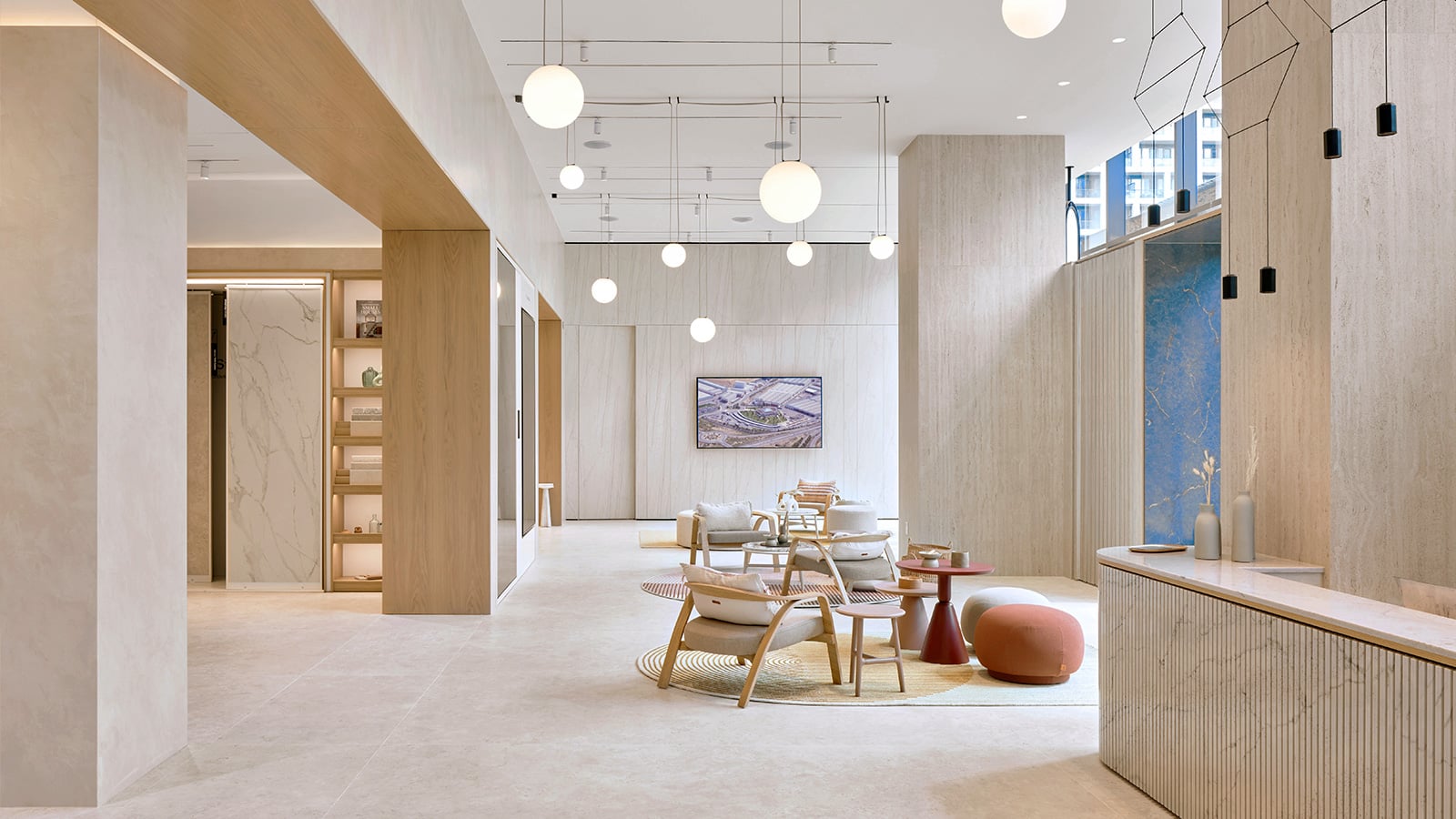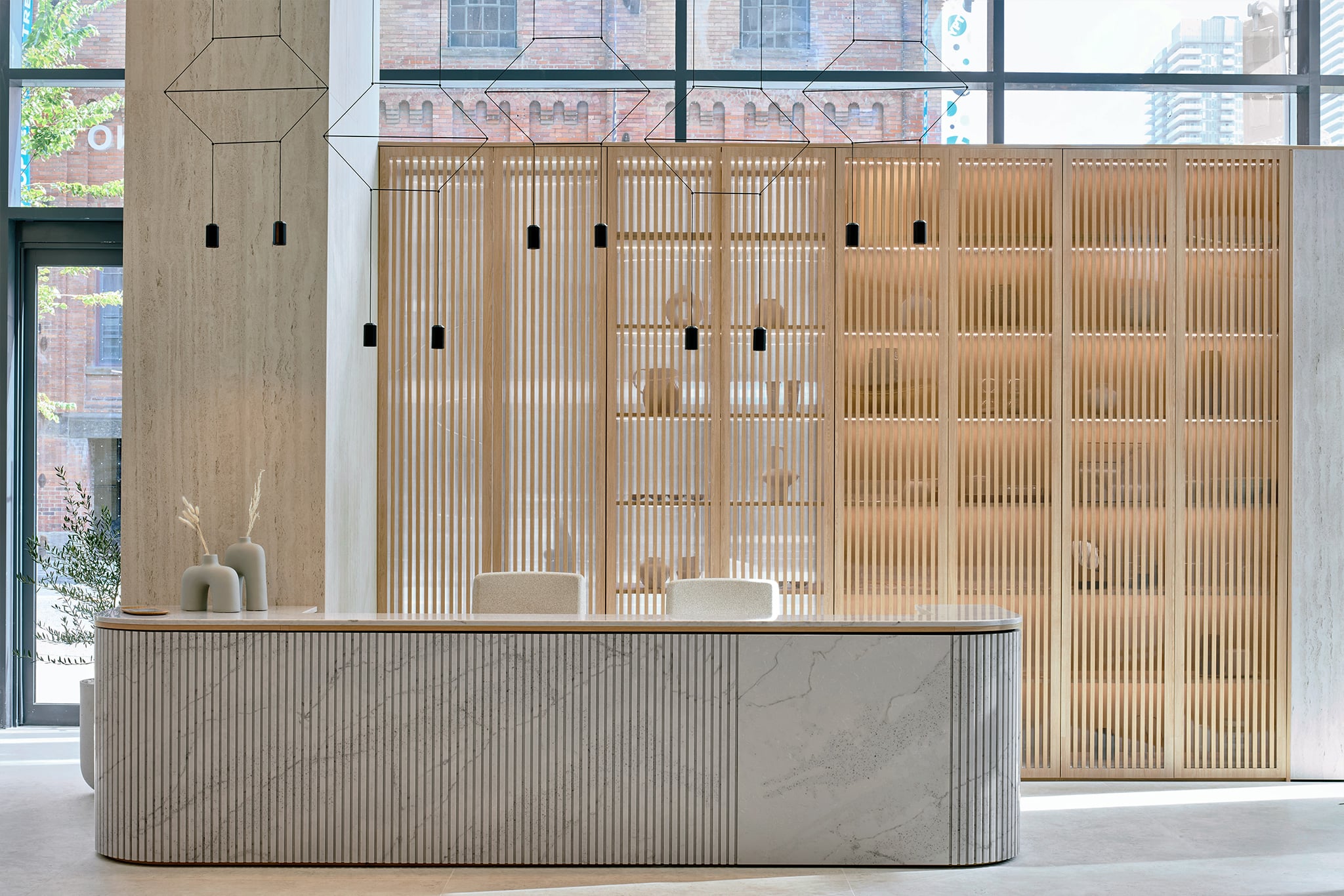 A typical surfacing showroom can feel a bit like a carnival funhouse — one in which floor-to-ceiling mirrors are swapped out for towering stone-patterned slabs. Cosentino’s new Toronto flagship in the King East Design District takes an altogether different approach. Yes, there is still plenty of surfacing, but rather than being arranged into a maze of giant rectangular blocks, most of it is displayed the way you might find it installed in an actual home or hospitality setting.