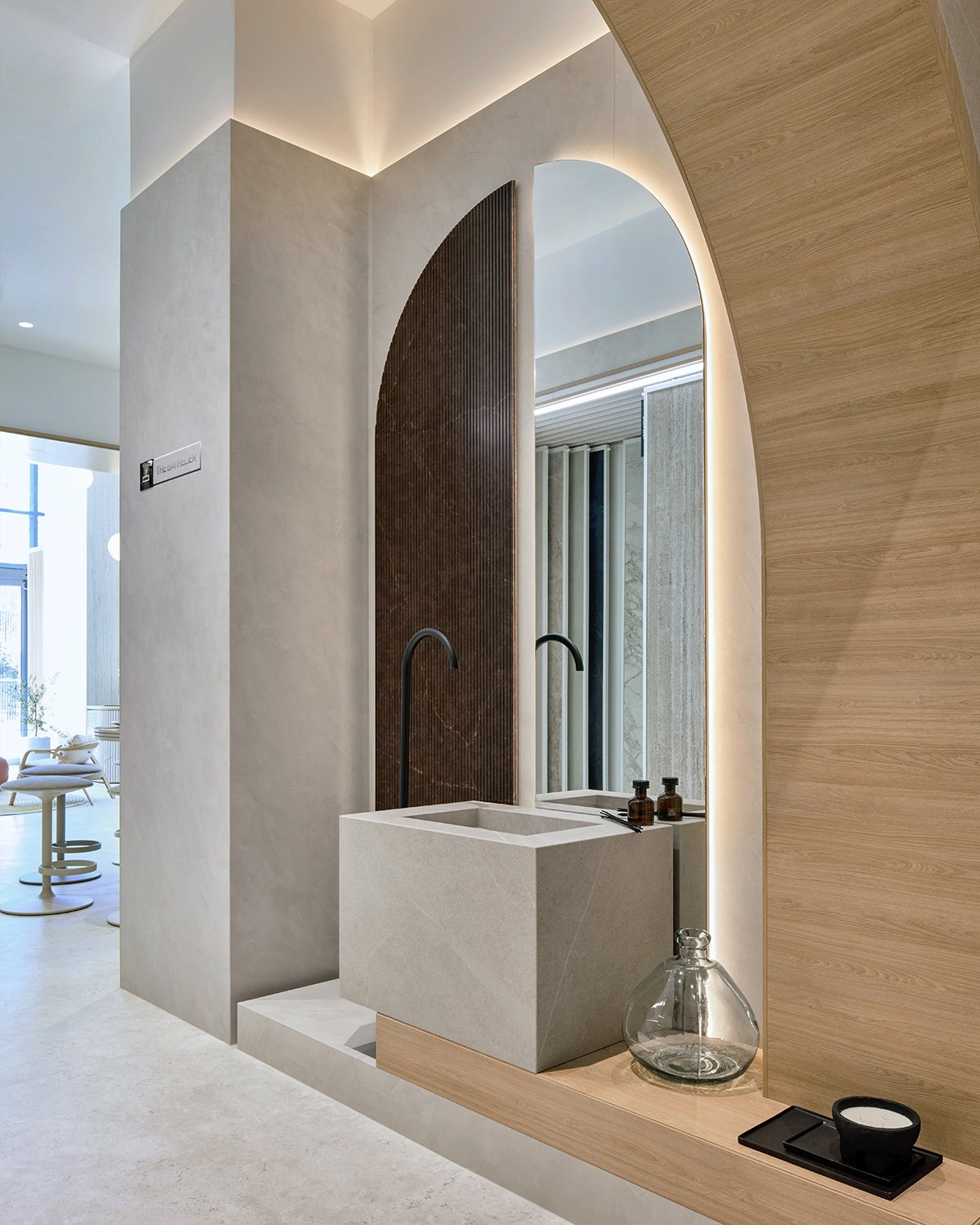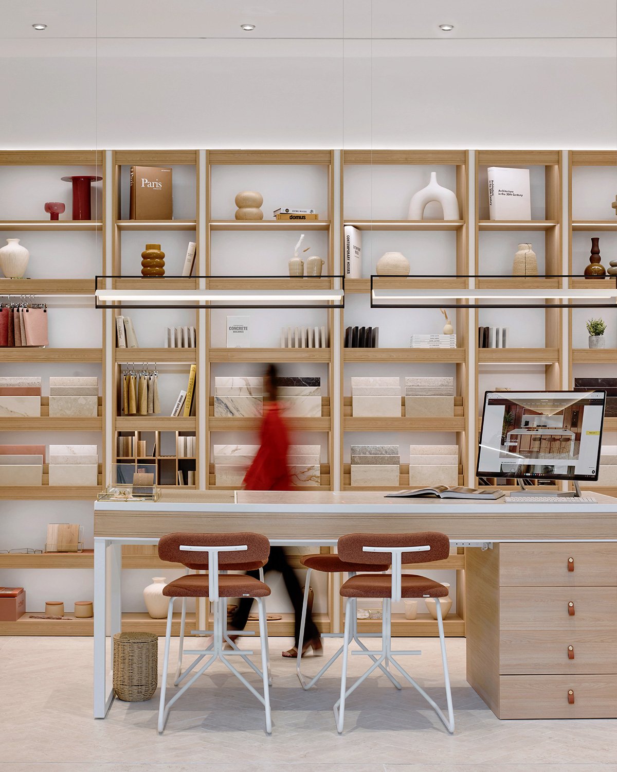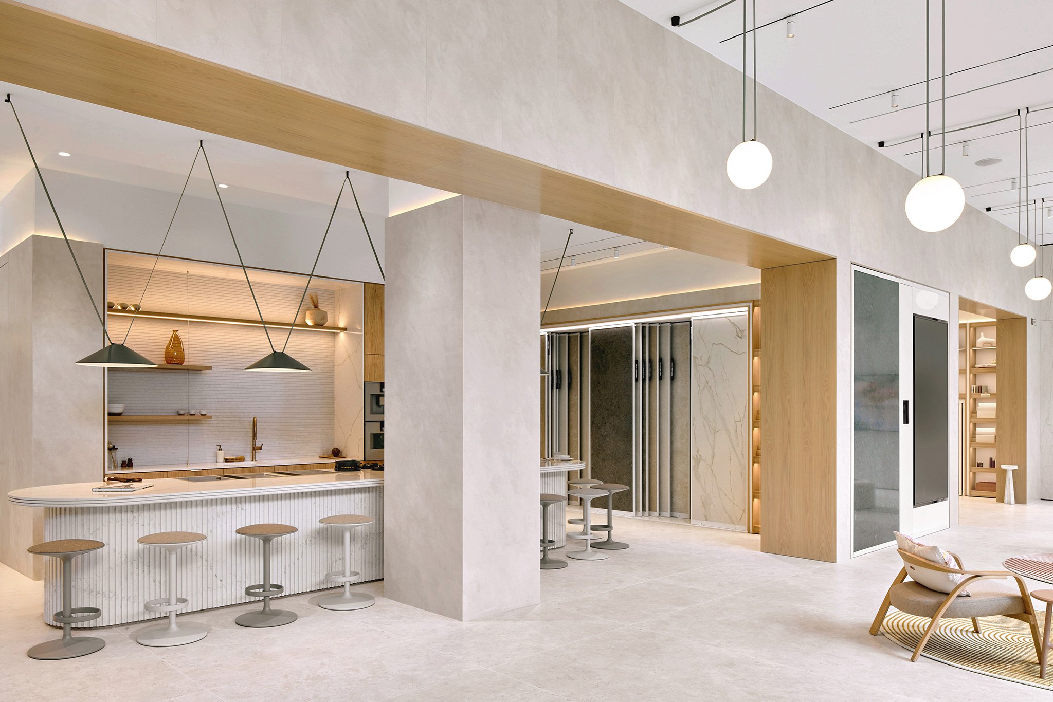 And while actual slabs may not be placed front and centre in the showroom, there are still plenty of them to admire. Rows of large panels showcasing Cosentino’s extended product range slide out from (or across) one of several walls in a series of discrete display areas, including the library-like Atelier dedicated to helping visitors plot out their own projects. “By blending practical resources with creative spaces, the showroom is both a working tool and a place to spark new ideas,” says architect Heather Dubbeldam.