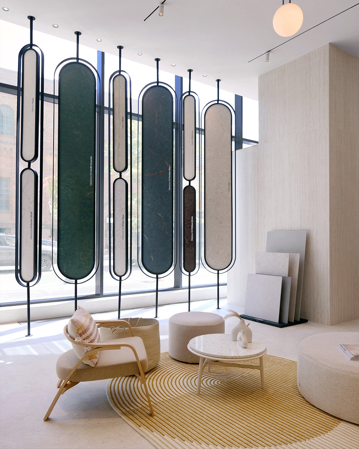 In another area, several of the manufacturer’s signature offerings are cut into pill-shaped displays installed inside of metal frames that allow for 360-degree rotation. Stationed in front of a wall of double-height windows, these work to modulate sunlight when needed while otherwise still allowing for views of the city outside.