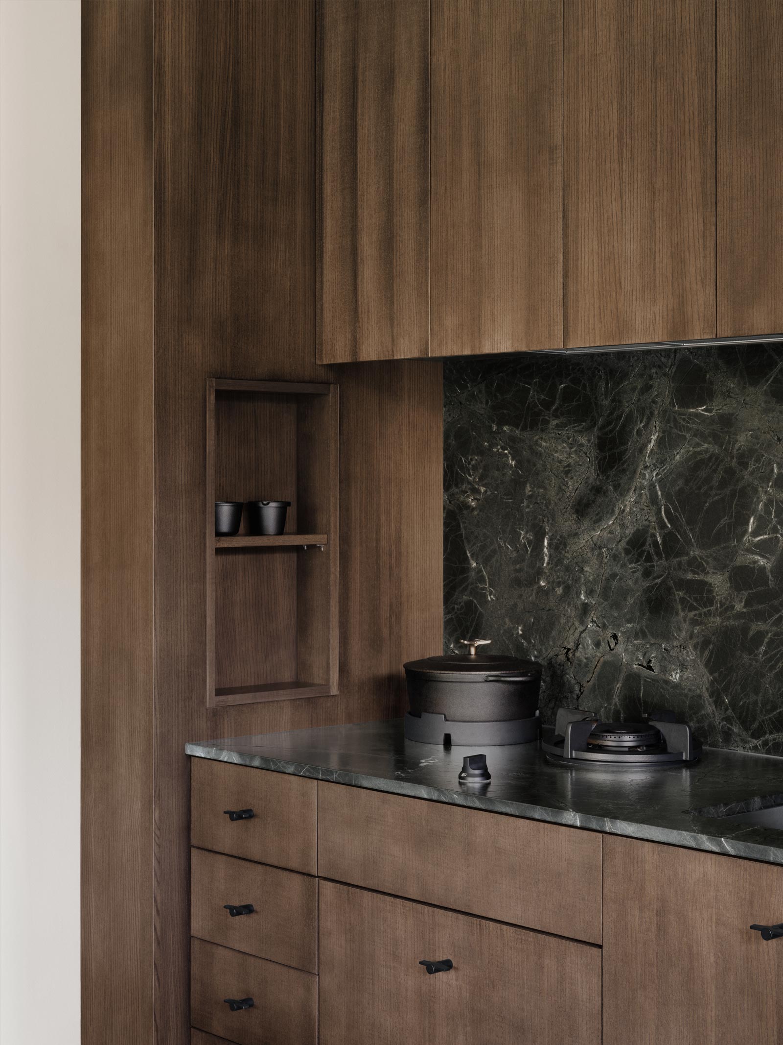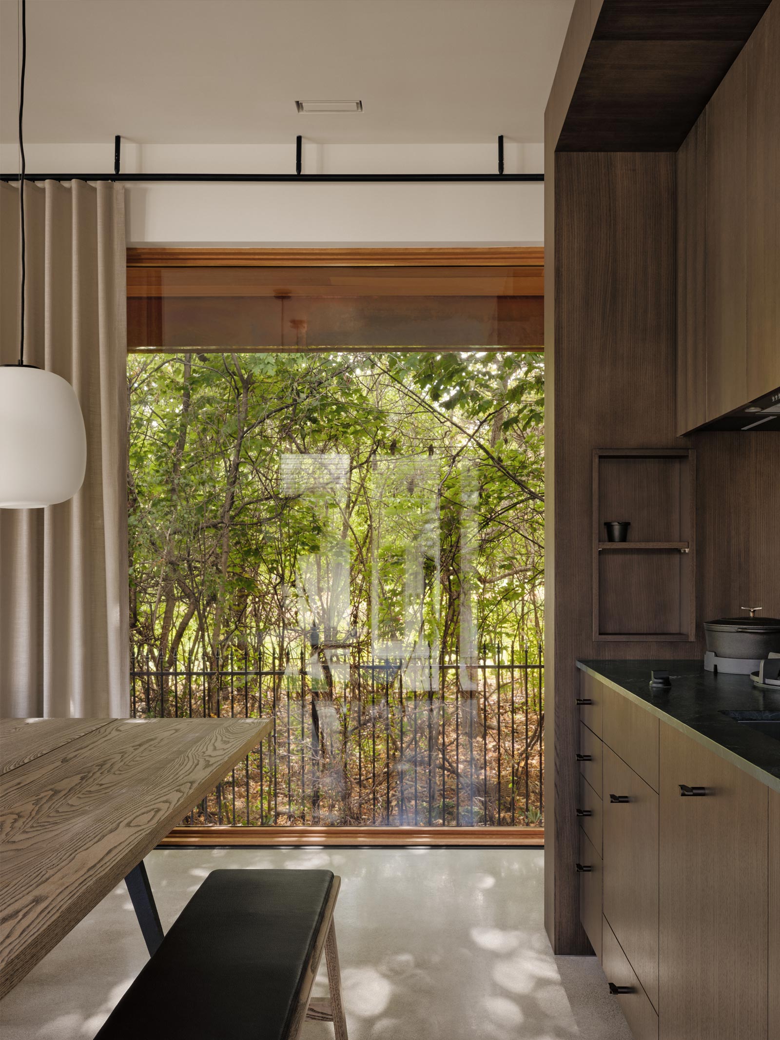 Inside, the garden suite’s central core acts as a buffer between the secluded bedroom and wide-open dining/living zone, introducing a hallway on either side. “Having two passages was important,” says Abbott. “In a small space, giving more options opens things up — there’s two ways out, so you can avoid bumping into someone.” The compressed dimensions of these corridors also shape the experience of moving through the building. “You’re passing through shadow to get to lightness,” he says. To accentuate that, he set out to make the core a “dark, anchoring mass.” An ash dining table sourced early in the design process went on to inspire the wood used for the central millwork, while the dark kitchen counters and backsplash adopt a complementary quartzite.