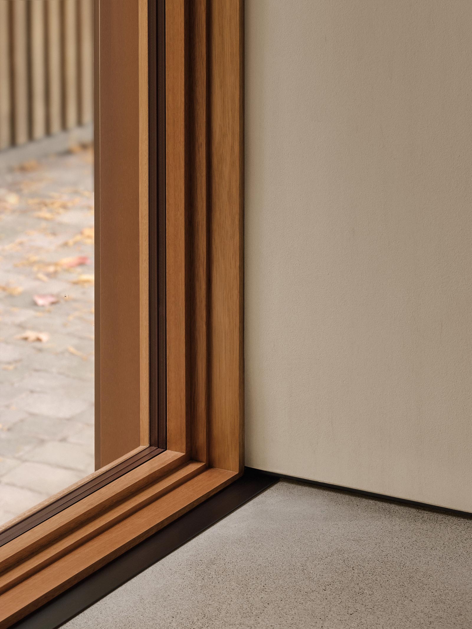 Beyond its material palette, the exterior is defined by precise geometry. An overhanging “forehead” runs along the top edge, divided into evenly sized panels that establish “this perfect optical rhythm,” explains Abbott. “We added a little bit of furring behind to hold tension in the material, which allowed us to go a bit wider with the copper than usual and also creates a bit of a scalloped feel.” Below, vertical copper panels continue in even proportions until an opening — one of the project’s deep window frames or bi-fold doors — introduces what Abbott calls an “interruption” to this rigid arrangement. Then again, the bi-fold doors are divided into their own equal segments, so logic still prevails. While the building is far more private than a glass house would be, these doors nevertheless introduce plenty of light — as well as a free-flowing connection to the outdoors when they are fully opened in summer.