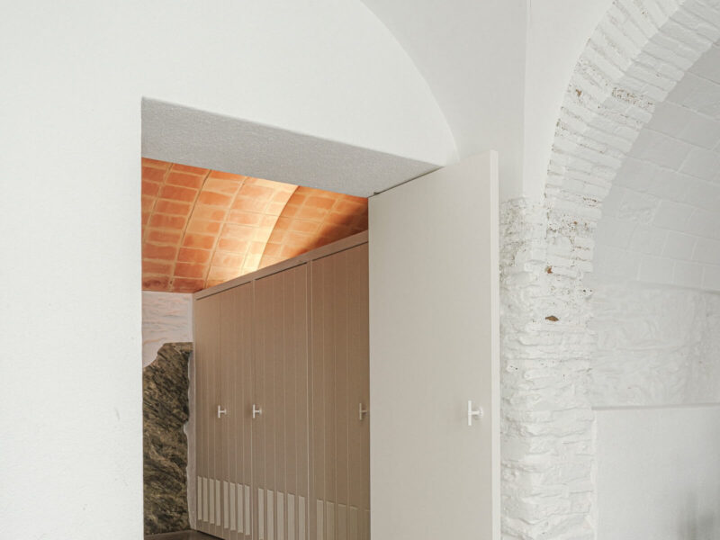 Beyond its material palette, the exterior is defined by precise geometry. An overhanging “forehead” runs along the top edge, divided into evenly sized panels that establish “this perfect optical rhythm,” explains Abbott. “We added a little bit of furring behind to hold tension in the material, which allowed us to go a bit wider with the copper than usual and also creates a bit of a scalloped feel.” Below, vertical copper panels continue in even proportions until an opening — one of the project’s deep window frames or bi-fold doors — introduces what Abbott calls an “interruption” to this rigid arrangement. Then again, the bi-fold doors are divided into their own equal segments, so logic still prevails. While the building is far more private than a glass house would be, these doors nevertheless introduce plenty of light — as well as a free-flowing connection to the outdoors when they are fully opened in summer.
