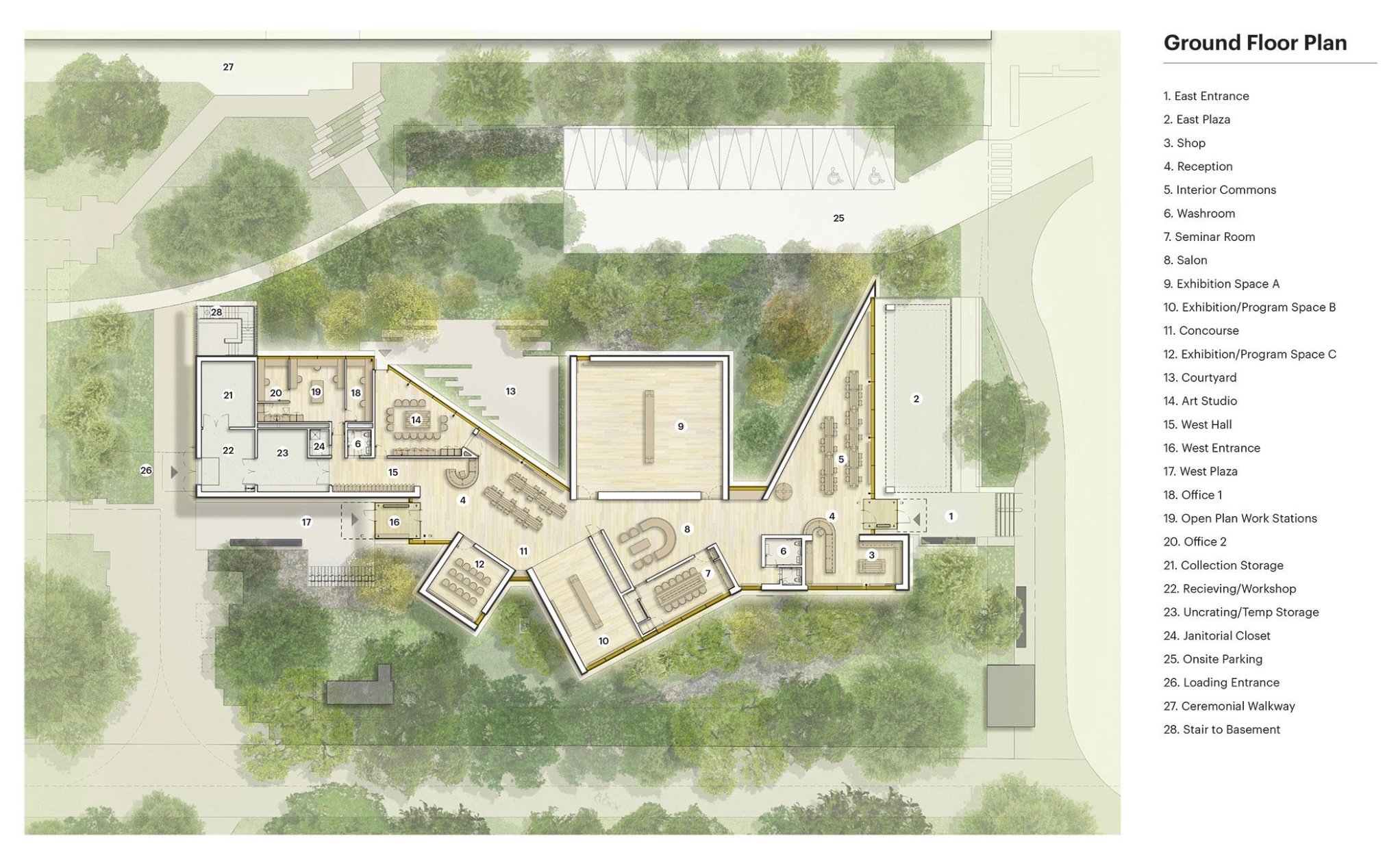 The Gibson is not unlike a microcosm of the campus itself. Its long spine, like the school’s famed central mall, opens up into different learning spaces and galleries, with an embrace of trees replacing its canopy of steel. Its unassuming design and welcoming student friendly spaces stay true to the original Ericksonian concept of dissolving boundaries between disciplines and academic hierarchies. On a campus where some of Erickson’s original buildings have already been demolished, the Gibson Museum champions the school’s original architectural language while mediating a dialogue with the more recently constructed high-rise towers to the east.