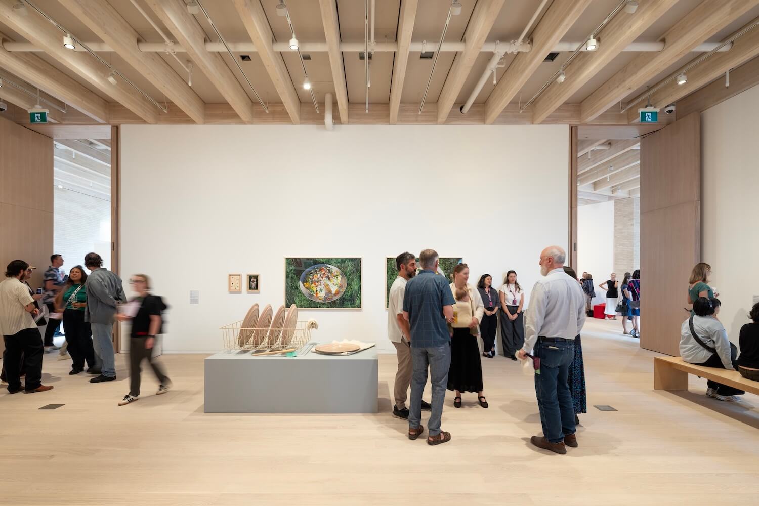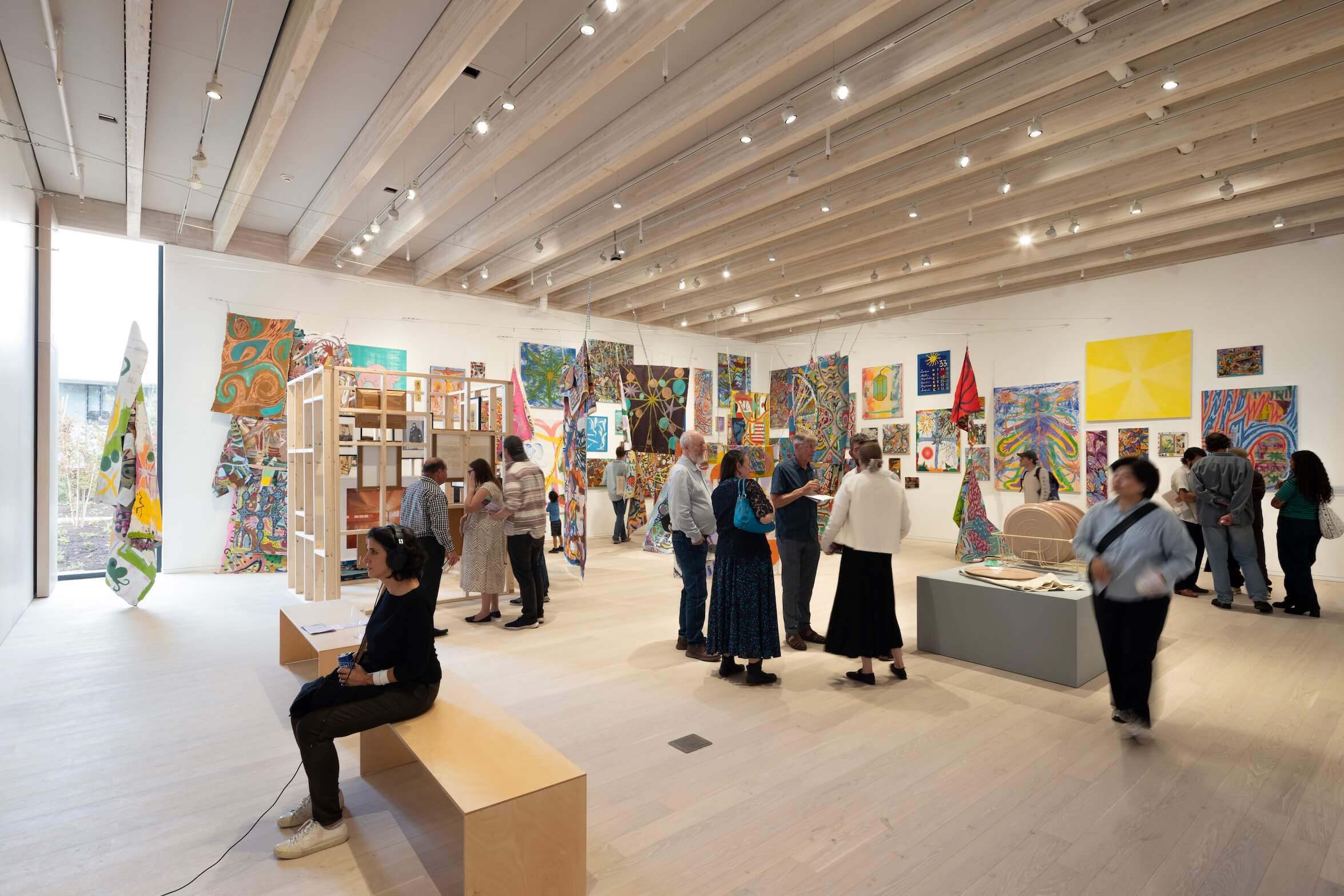 Walking past small side galleries, a compact museum shop, and a library, visitors are drawn into a central, hearth-like ambiance. A semi-permanent installation by Cindy Mochizuki called Arboreal Time channels Japanese forest spirits above a fireplace, while plush, inviting seating beckons passerby to slow down and take a closer look. It feels like a living room. Four formal galleries and program rooms surround the intimate central space, each of which can be closed to create light- and climate-controlled conditions as needed.