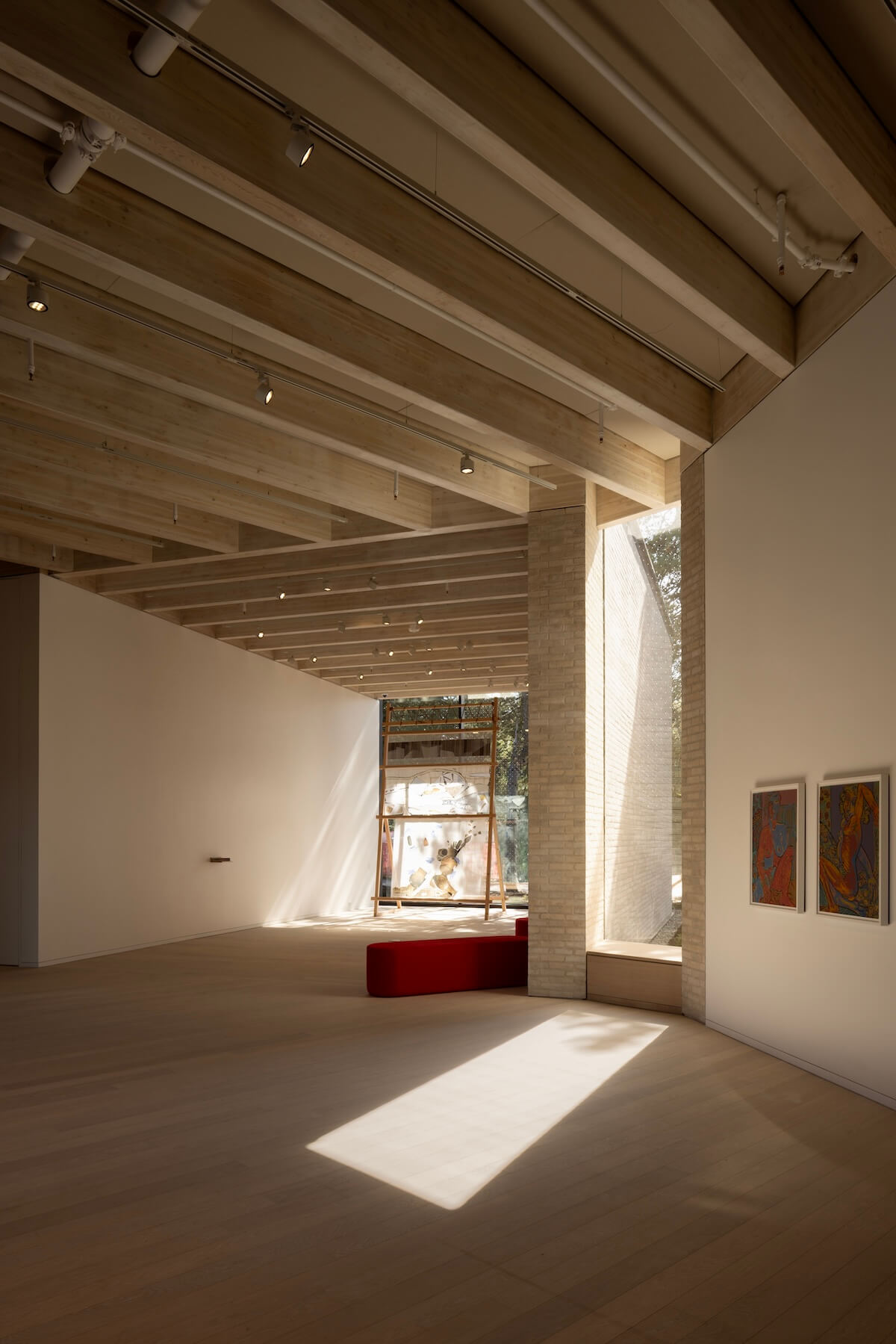 At the west end of the museum, a slightly smaller entrance and reception opens out to the campus — while the loading dock is discretely tucked to the side. Throughout the building, a series of well-choreographed geometries offer a sense of dynamic movement, and the use of elegantly thin buff brick provides a visually pleasing texture and contrast to the building’s wood body. Made from locally sourced mass timber beams, the structure is revealed in the rhythm of long exposed joists that cut across the ceilings.