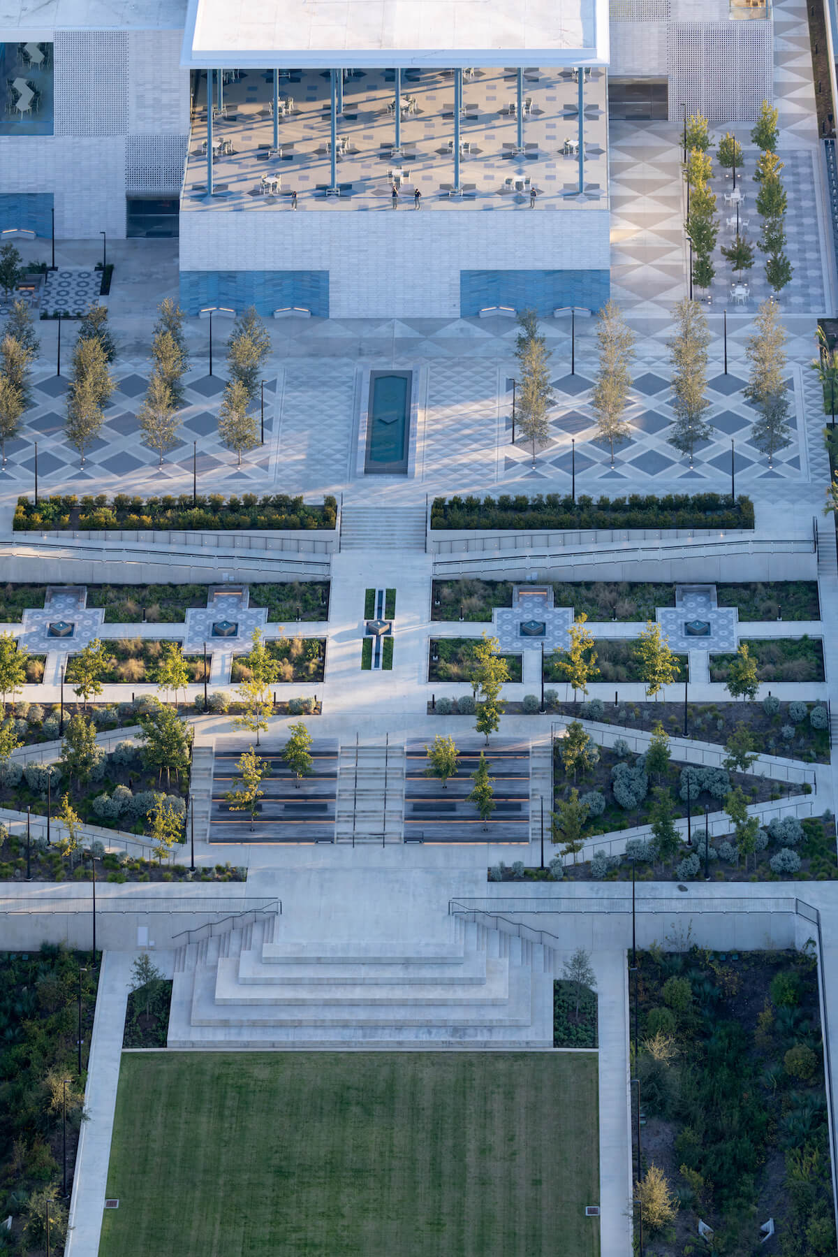 Framing it all, a sprawling (yet carefully proportioned) nine-acre landscape introduces tree-lined promenades, public gardens and a reflecting pool, with a design led by Nelson Byrd Woltz’s Thomas Woltz. A thoughtful emphasis on native plantings and shaded pedestrian walkways ensures a pleasant — and deeply local — sense of place. A massive yet welcoming lawn can accommodate up to 1,000 people for performances, celebrations and community events.
