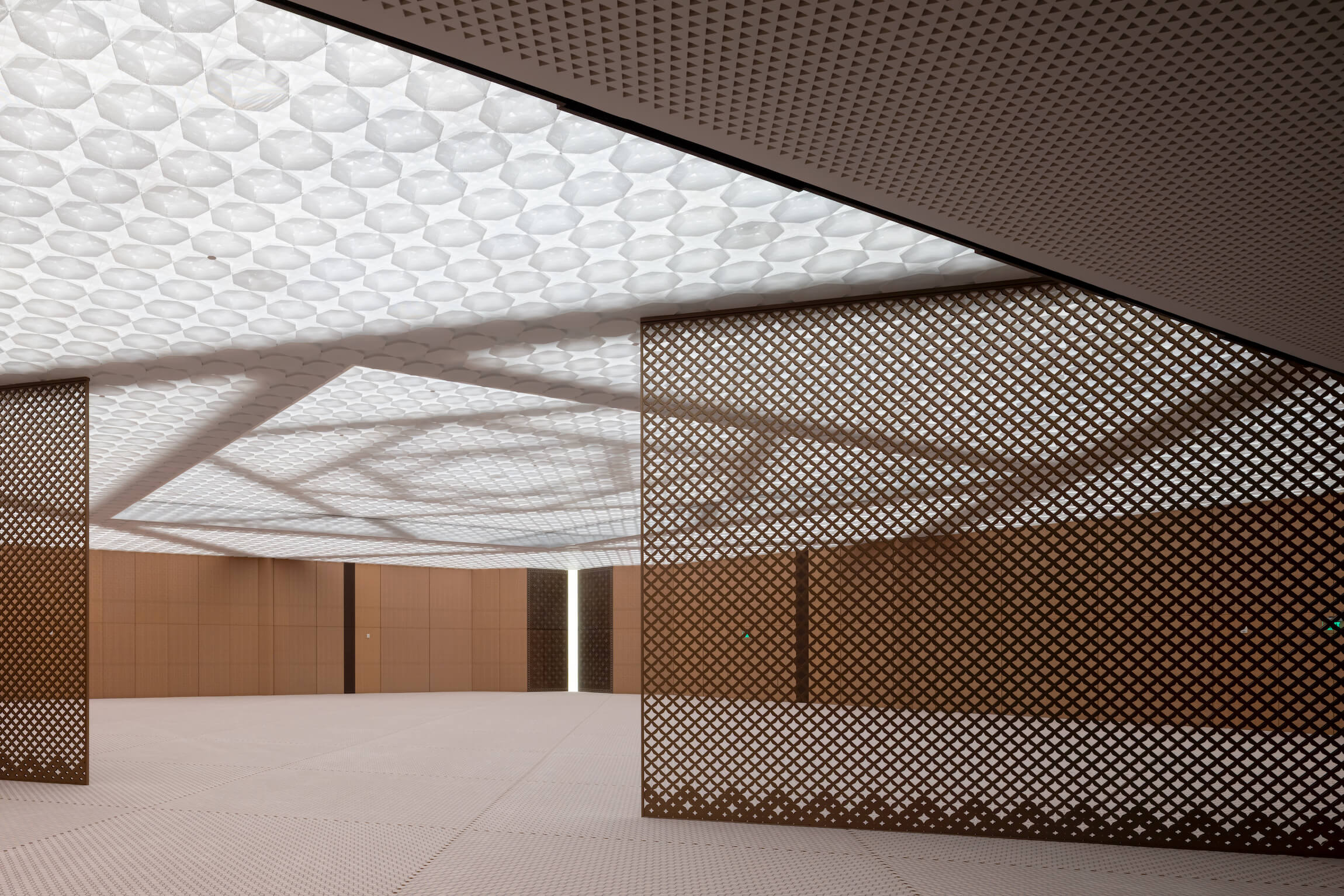 Here, a seemingly ethereal translucent ceiling draws the eye up to an exquisitely patterned fabric screen stretched over a constellation of LEDs. Meanwhile, an adjacent atrium creates a natural civic and social hub to complement the ceremonial function. Held up by heroically scaled composition of Vierendeel trusses, the atrium opens out to a dramatic oculus that floods the space with the light.