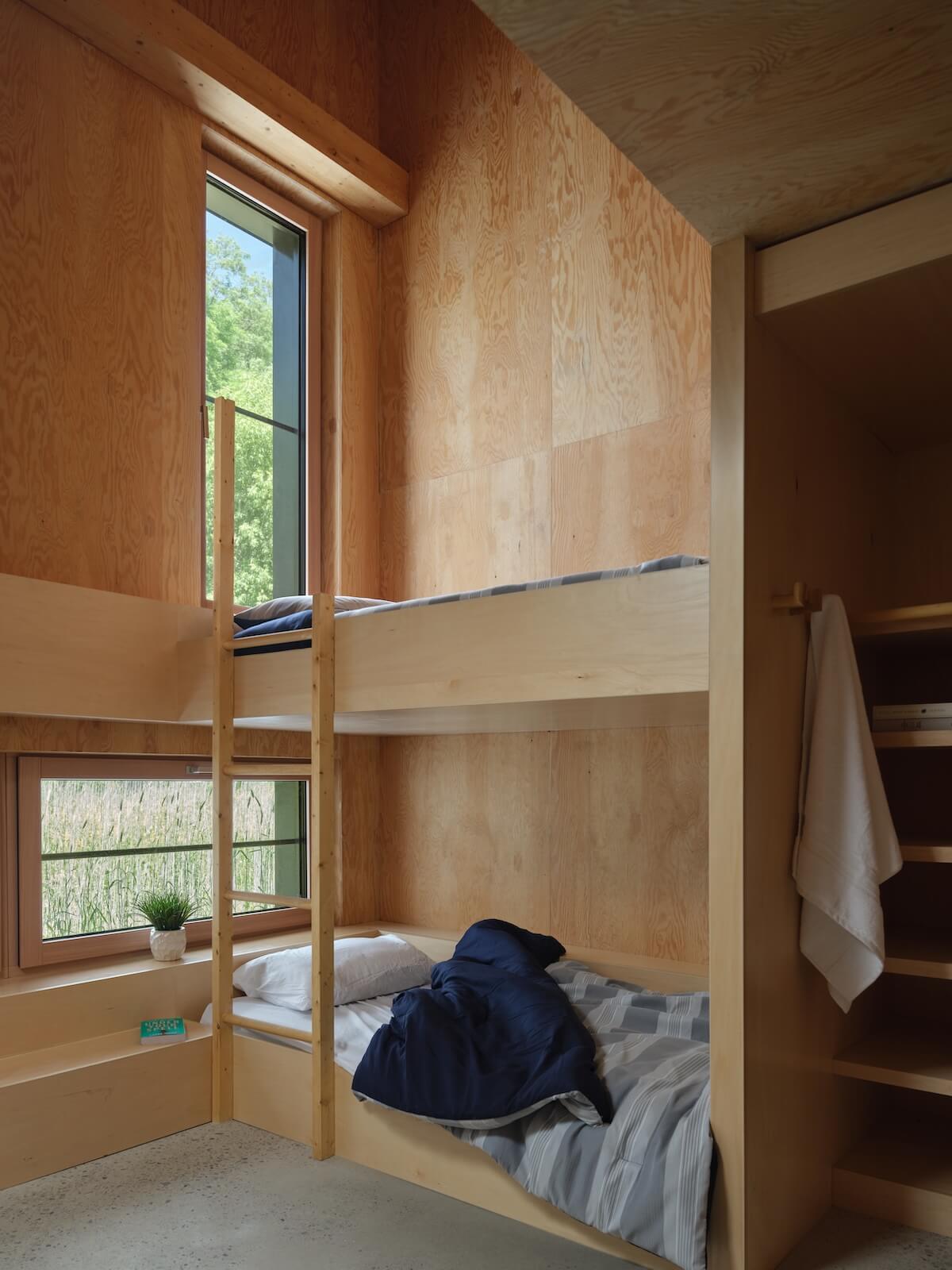 The tall commons volume overlooks a courtyard; dormitories and bathrooms are located on the other side of the quad. In between, a central wood-panelled circulation corridor is paired with a generous mud room. On the far side of the C-shaped building, and tucked into a corner that summertime bunkie residents can access via a separate entrance, are the shared bathrooms.