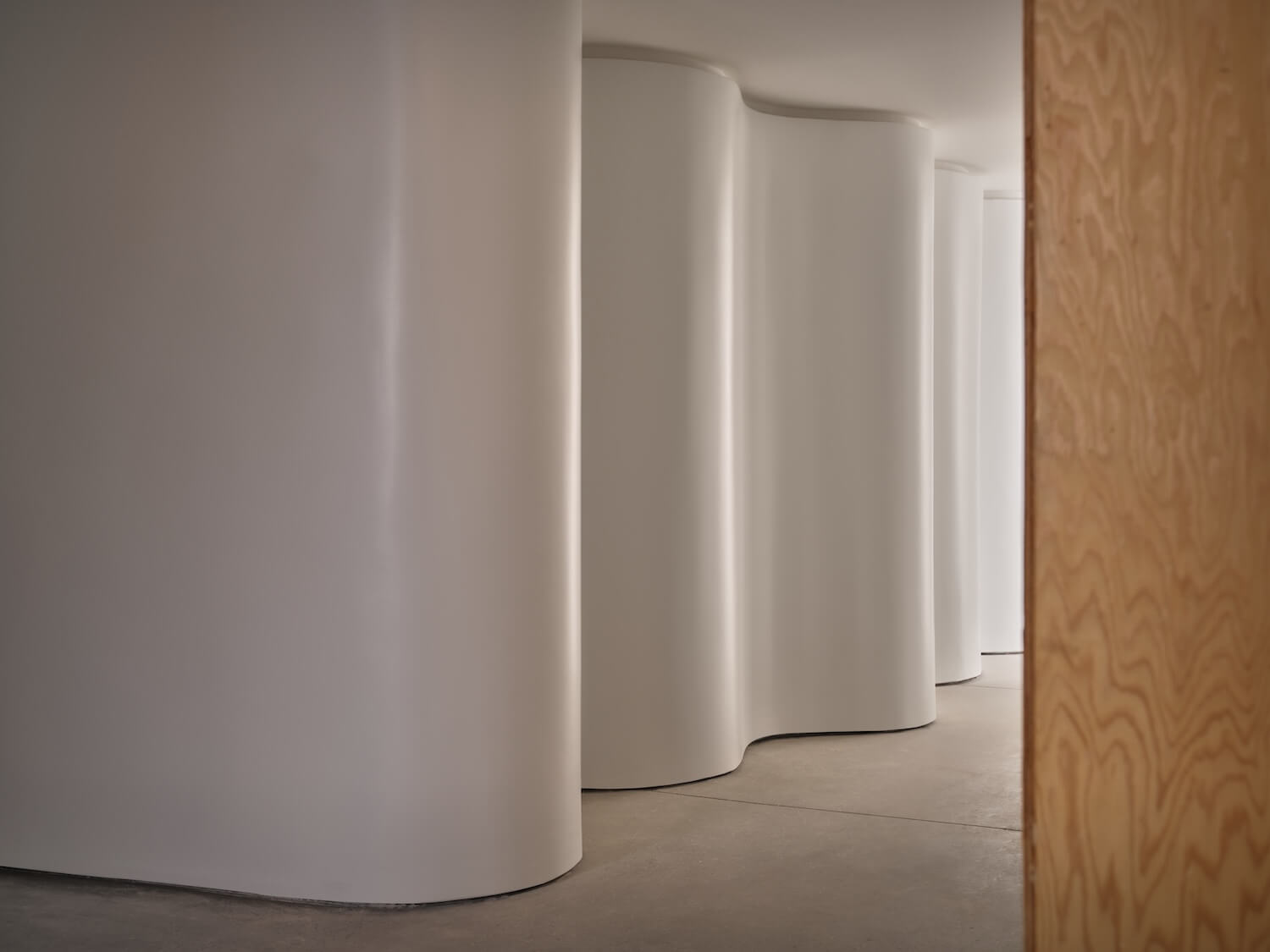Here, the visual language of light wood and linear geometry gives way to a sinuous white composition inspired by the form of an amoeba under the microscope. Down the hall is a row of five bedrooms, each boasting four beds; every suite is fronted by an angled entryway that creates a subtle but palpable separation between public and private zones.