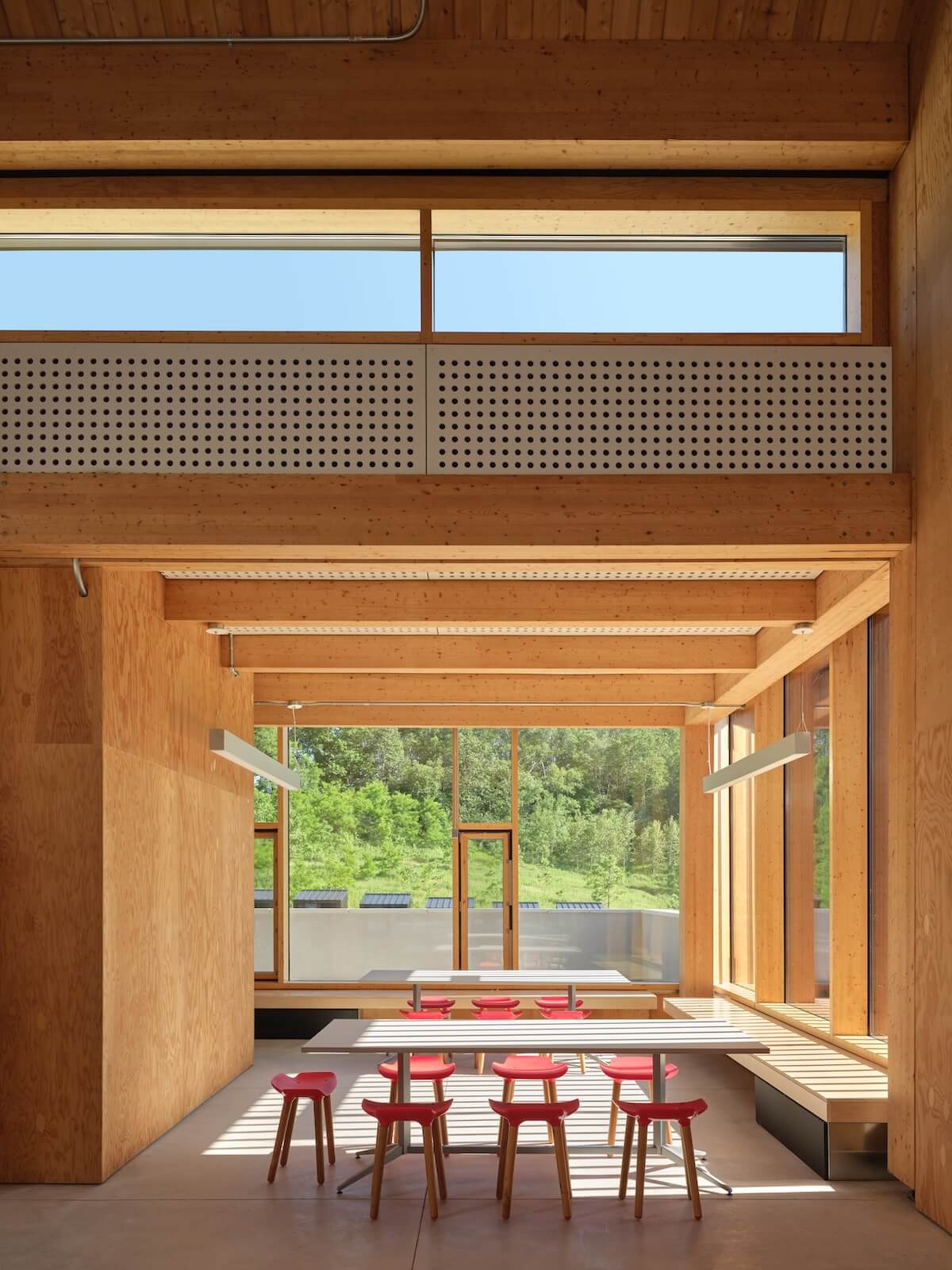 Of course, an efficient and carbon-conscious building takes much more than solar panels. While power generation influenced the angular forms, the project is just as profoundly (albeit slightly less conspicuously) shaped by the movement of light, air and heat. Framing the common room’s pitched elevation, a flat roof and sunshade is carefully positioned to welcome the warming winter sun while mitigating uncomfortable summer rays. Inside, the airy common space is contoured to move warmer air out of the building; an automated window system opens to release heat through the tall clerestory windows. Constructed with glulam columns and beams with a tongue-and-groove roof, the building is a hybrid of mass timber and conventional light-frame wood construction. The partially exposed glulam structure is complemented by simple, low-carbon finishes of gypsum board and plywood veneer, which emphasizes a connection to nature; these panels can be easily removed to allow for swift maintenance and repair work.