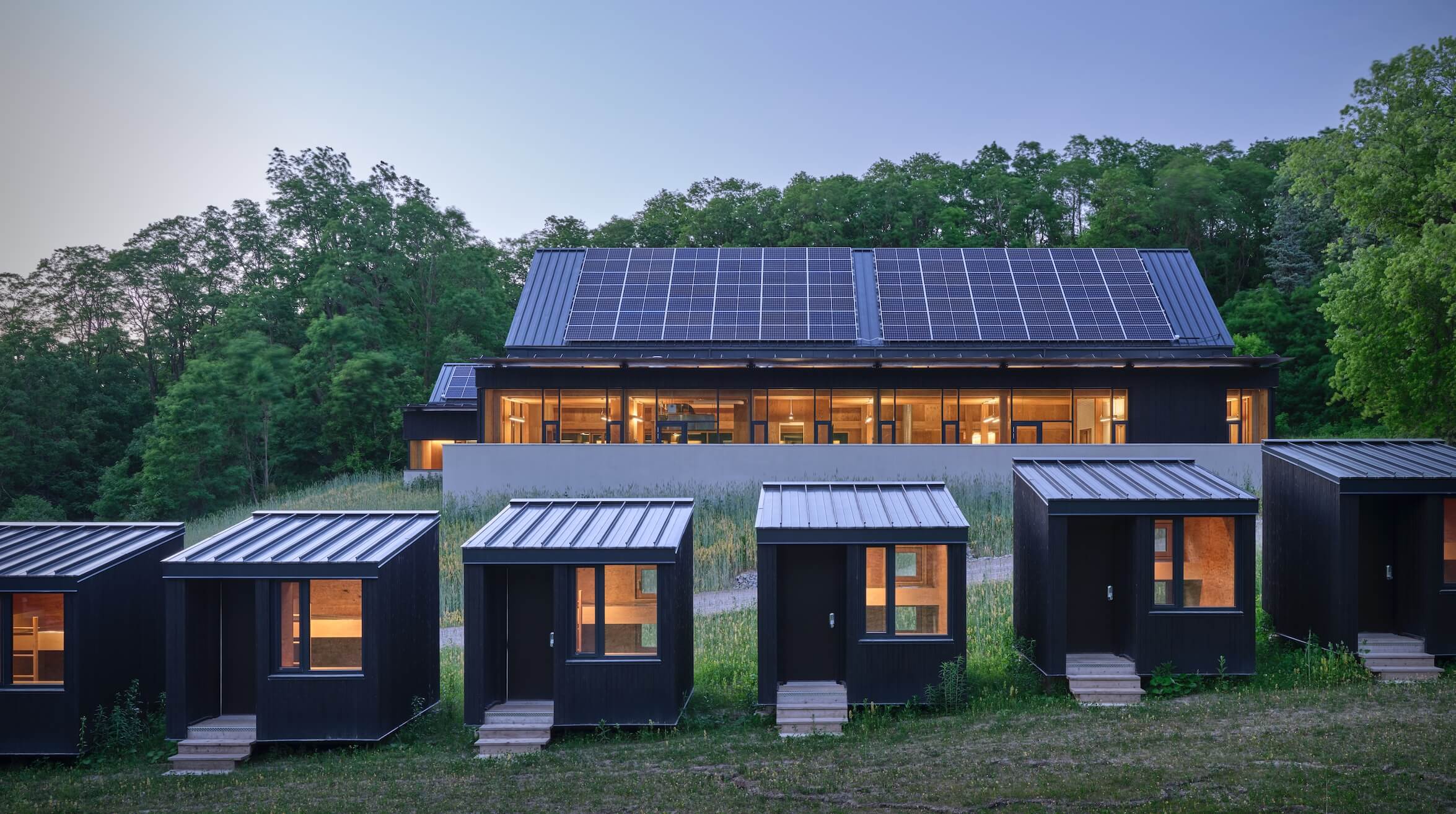 In lieu of a larger (and more carbon-intensive) centralized building that would remain at least partially empty most of the year, the university opted for an unconventional hybrid solution. The main building houses 20 students and the adjacent cluster of 20 bunkies accommodates up to another 40; the shared amenities in the main structure — like the kitchen, bathrooms and living spaces — are generously oversized to support a larger summer population and foster an inviting, convivial dynamic year-round.