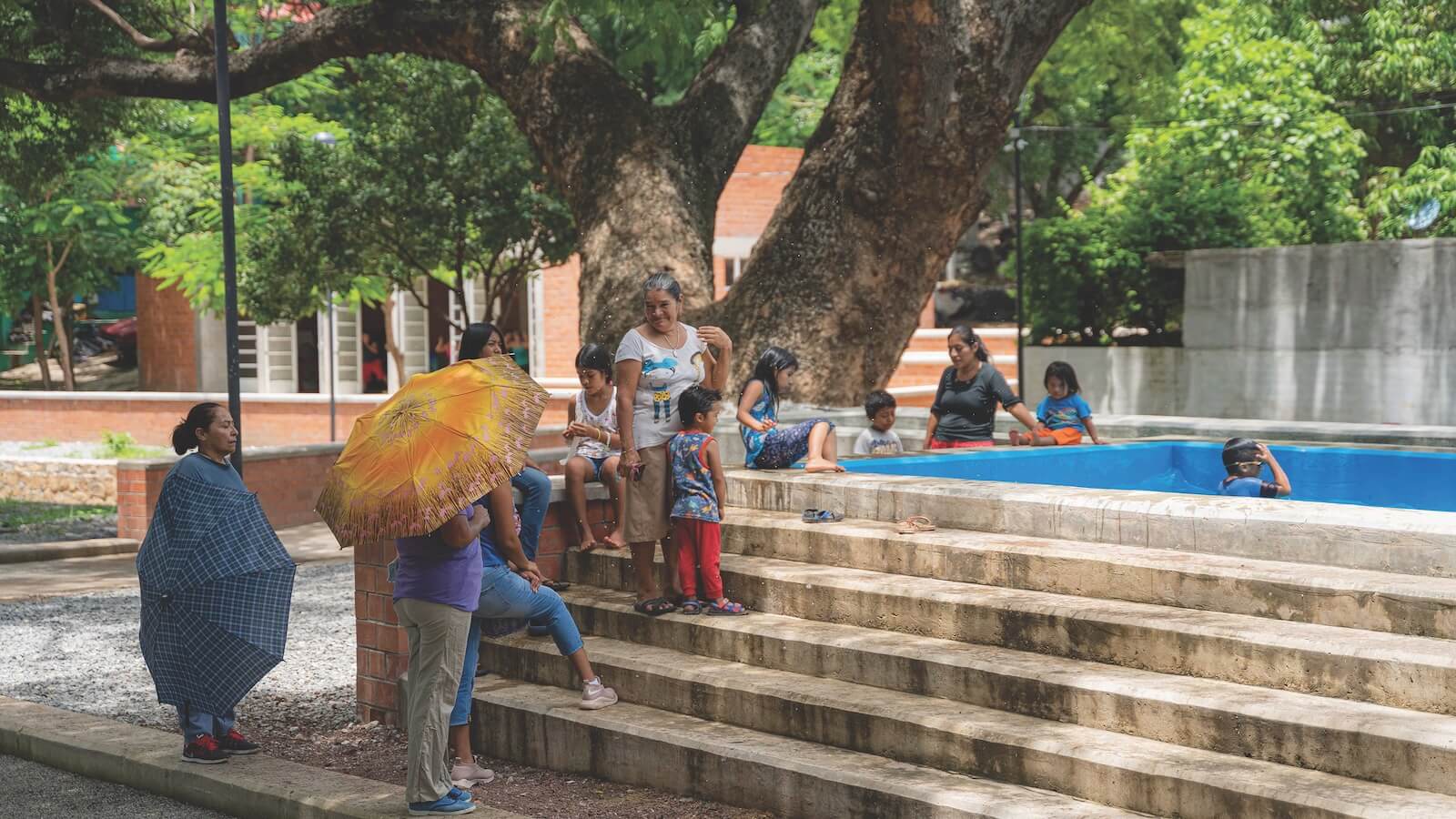 Last year, a park in the peripheral district of Las Granjas was renovated by Mexico City–based firm RZERO. The renewed space, known as El Aguaje, now features a central kiosk for neighbourhood assemblies, shaded walkways lined with trees, multi-purpose sports courts, and a communal laundry and play area near a seasonal stream. During rainy months, children splash in the recycled-water pool while their mothers chat nearby. Year-round, the park is teeming with life: Teenagers play ball at dusk, elders rest on benches beneath the trees, and families stroll along the walkways.