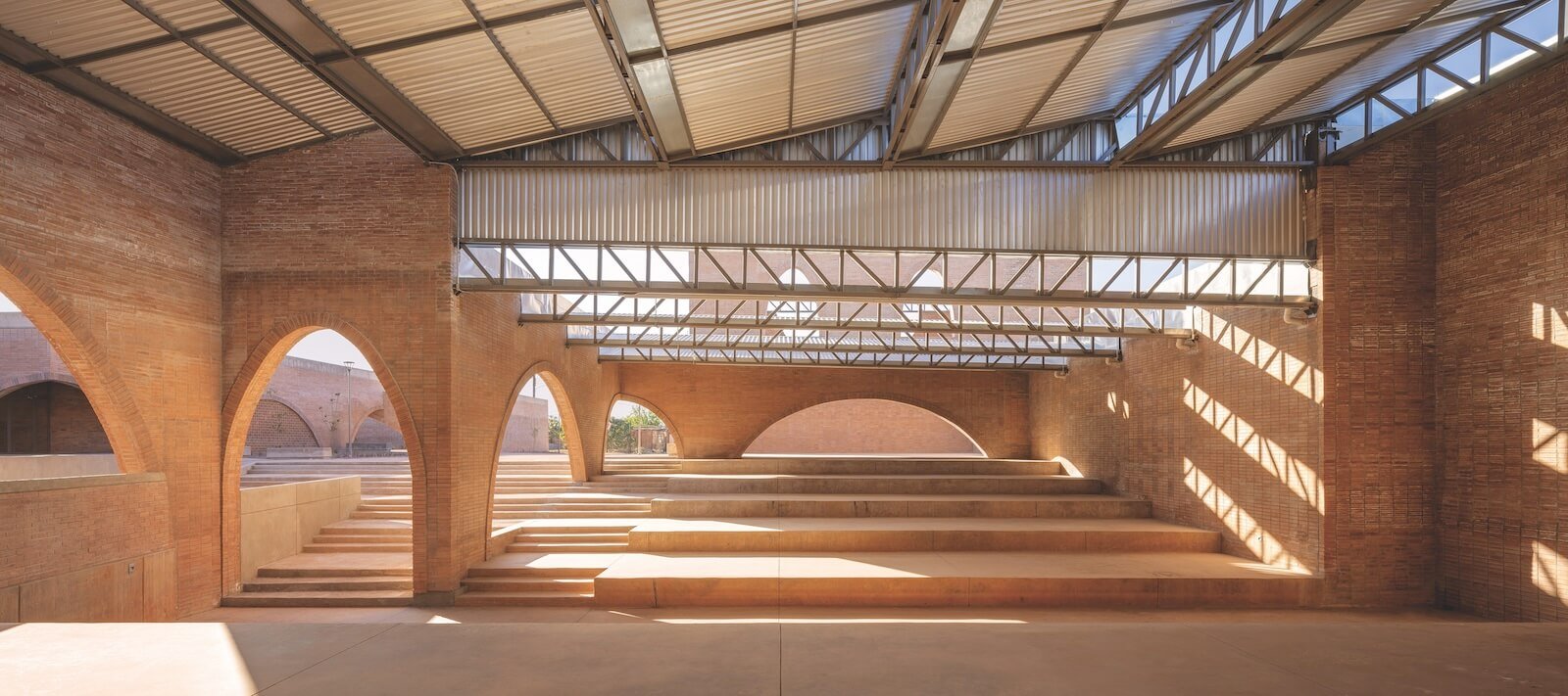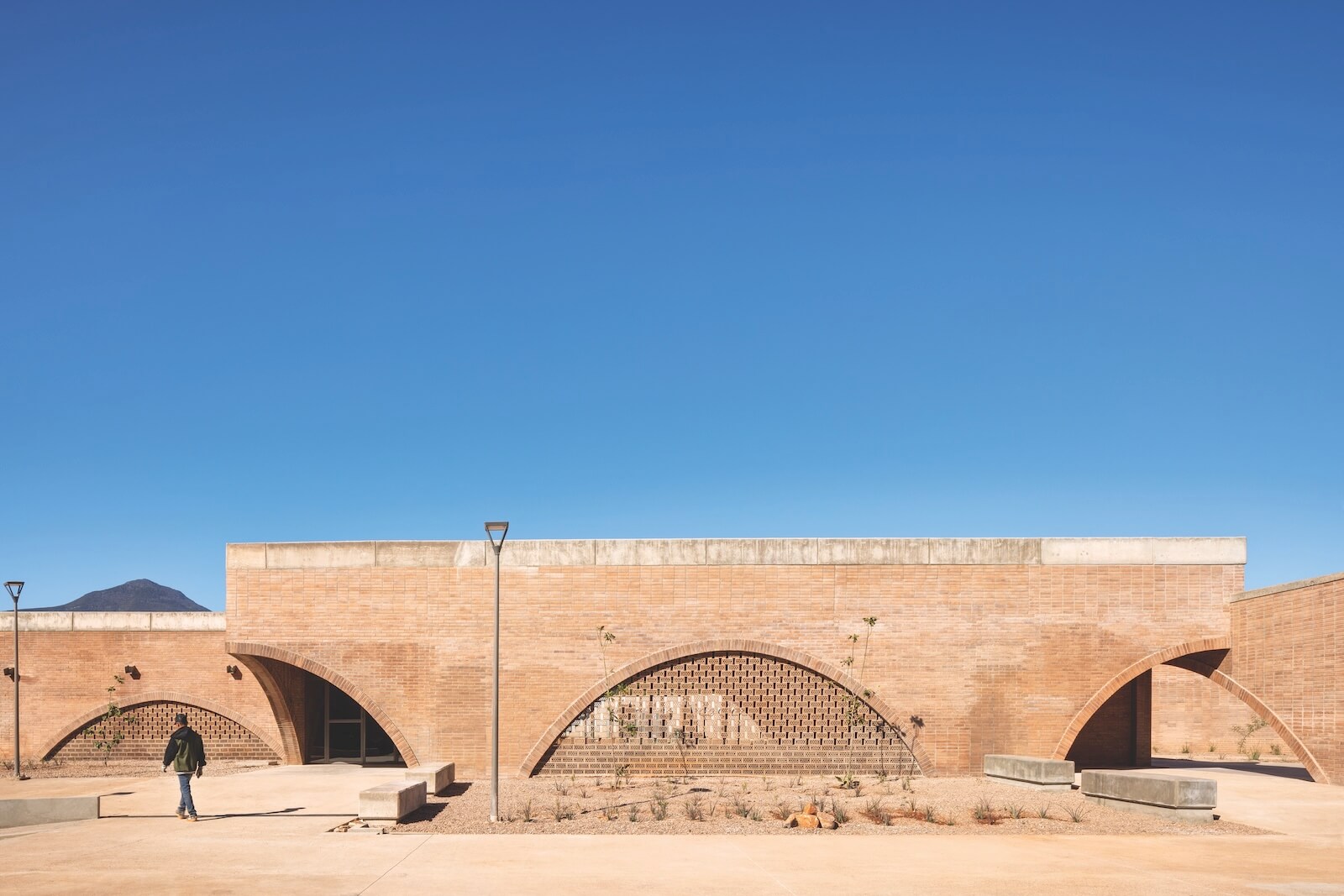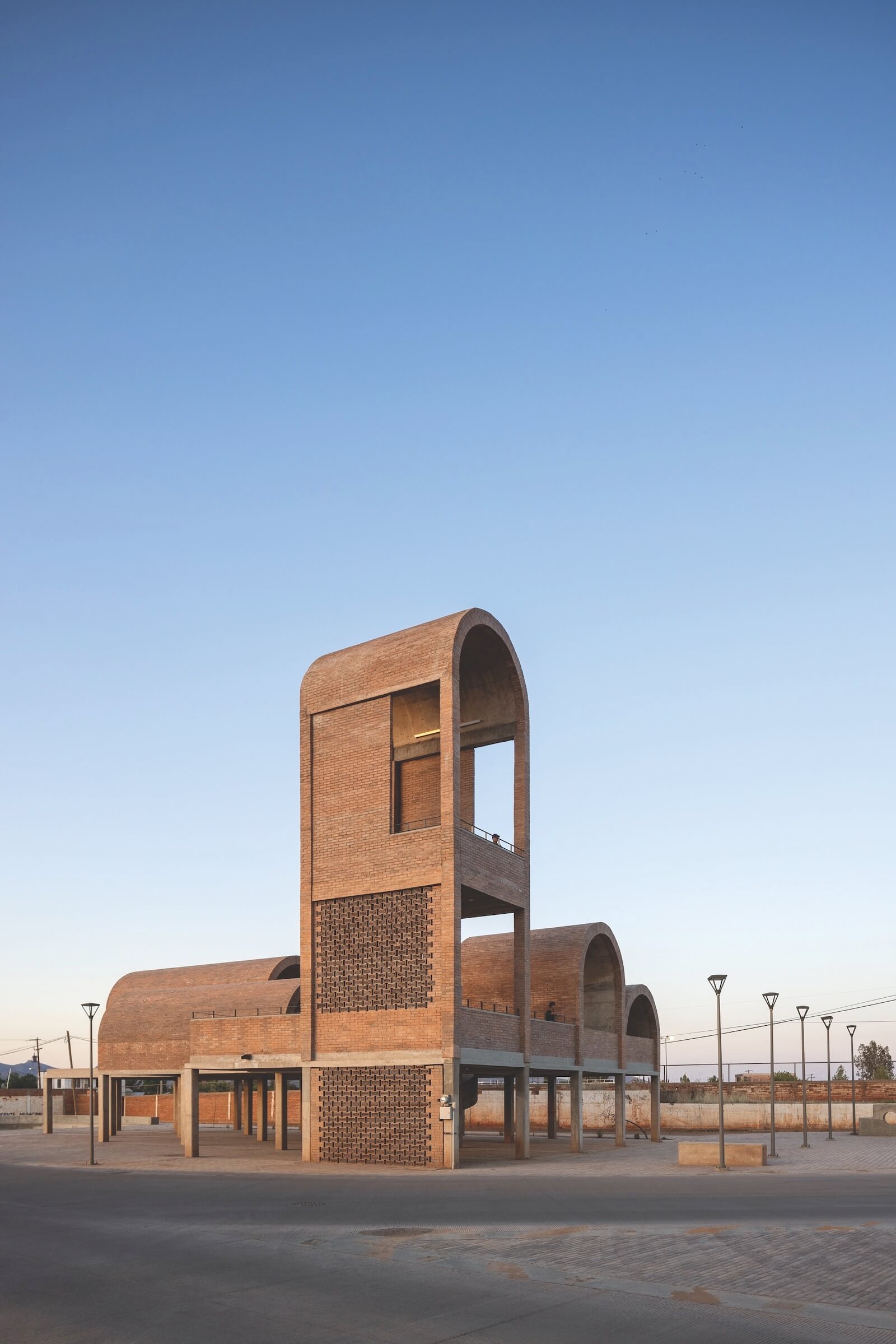For Naco, Canales reconceived the market as the entrance to the city: a plaza designed to slow down traffic and create safe pedestrian crossings, with several large shaded structures. The building is almost sculptural in its simplicity, consisting of a series of concrete columns and red brick barrel vaults that host a variety of informal uses and provide citizens with a unique perch from which to take in their surroundings. “It became a kind of lookout point where, for the first time, people could see their city from above, as well as the neighbouring city on the other side of the border,” says Canales. The auditorium, meanwhile, was imagined not as a sealed space used a few times a year but as a community centre made up of seven blocks that host a cafeteria, a daycare, a workshop area, classrooms, multi-purpose spaces, restrooms, and an open-air auditorium that functions as an extension of the sidewalk. Echoing the nearby market plaza’s formal qualities, the complex employs the same materials: concrete stairs that double as seating and brick walls with wide, arched openings that, in lieu of glass, feature lattices of perforated bricks.
