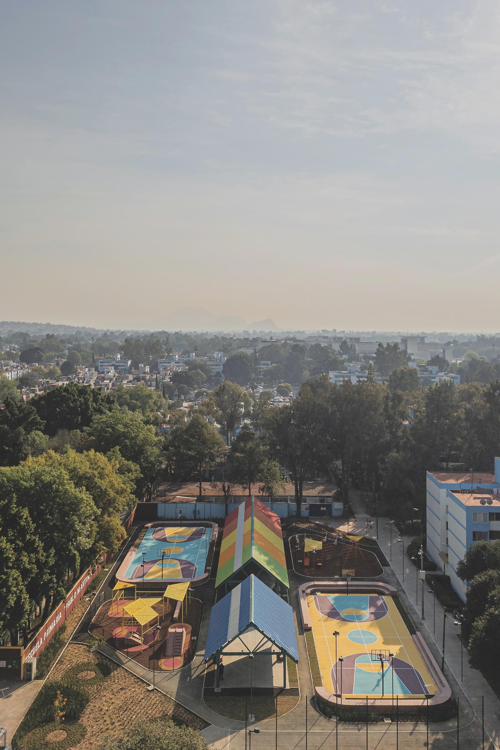 In Iztacalco, AMASA enclosed a deteriorated hemispherical structure, creating a vibrant covered forum that invites social interaction and exercise. Meanwhile, their work at CTM Culhuacán (above) turned a dilapidated plaza into a lively community hub with playgrounds, sports courts, and gathering spaces designed with input from residents.