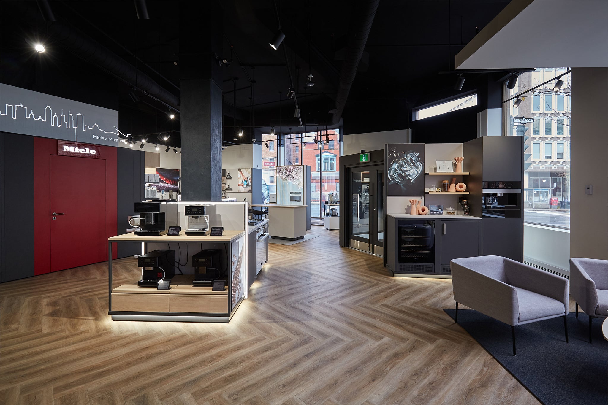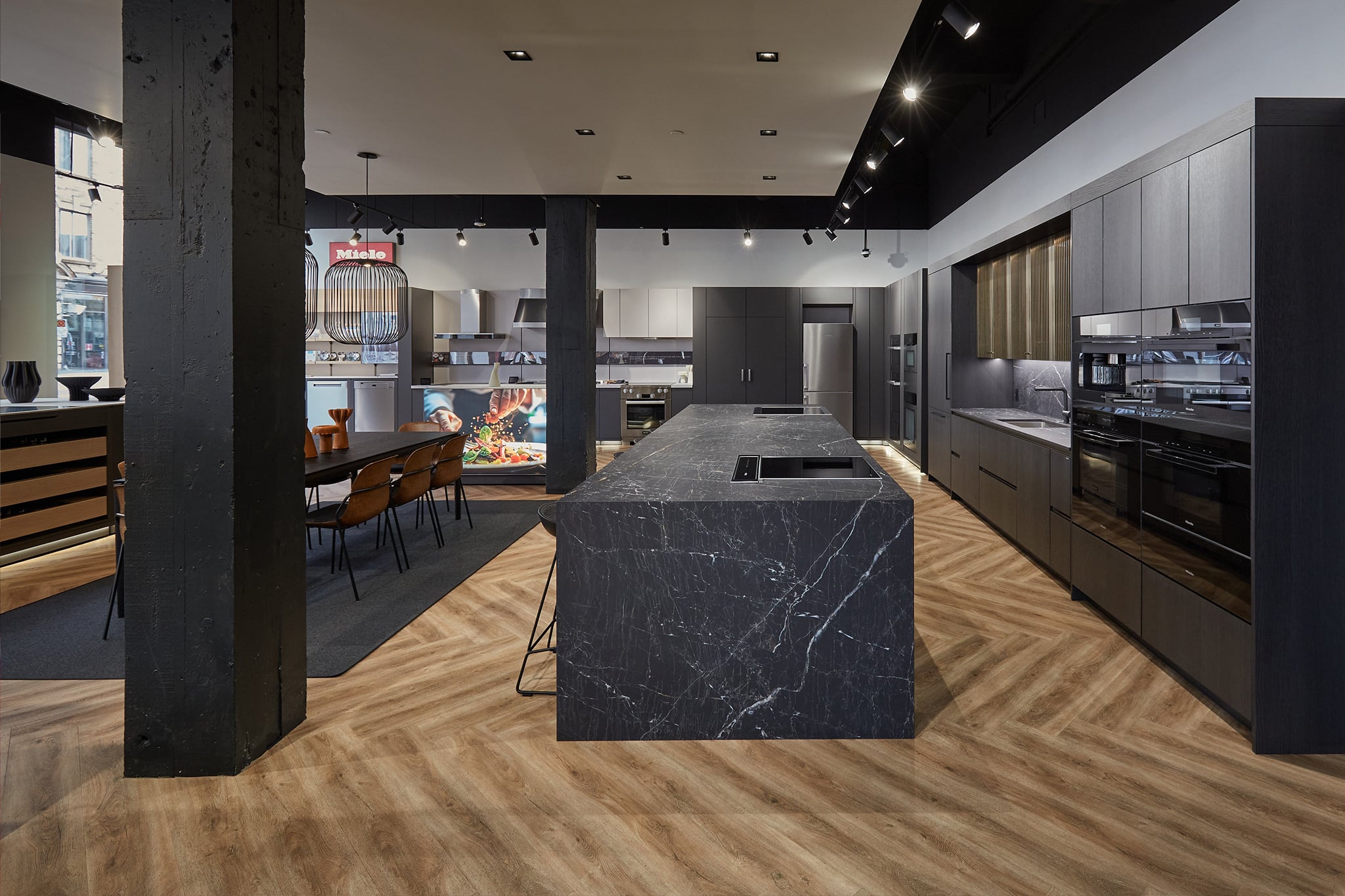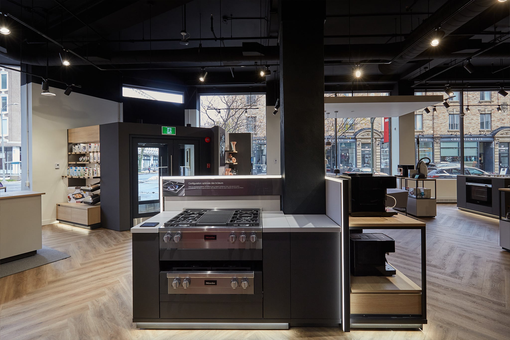 This latest Miele outpost, which opened last fall, replaces a previous store in Laval and reflects an intensive, three-year location scout. “I think what I fell in love with most about this setting was the neighbourhood,” says Nelson Fresco, president and CEO of Miele Canada. “It feels like our clientele.” Following recent expansions in Vancouver, Calgary and Toronto, Fresco describes this latest store as “the final piece of the puzzle for us in Canada.” The look remains consistent with other international Miele Experience Centres, emphasizing precise German engineering through clean lines and dark finishes, all while placing appliances front and centre.
