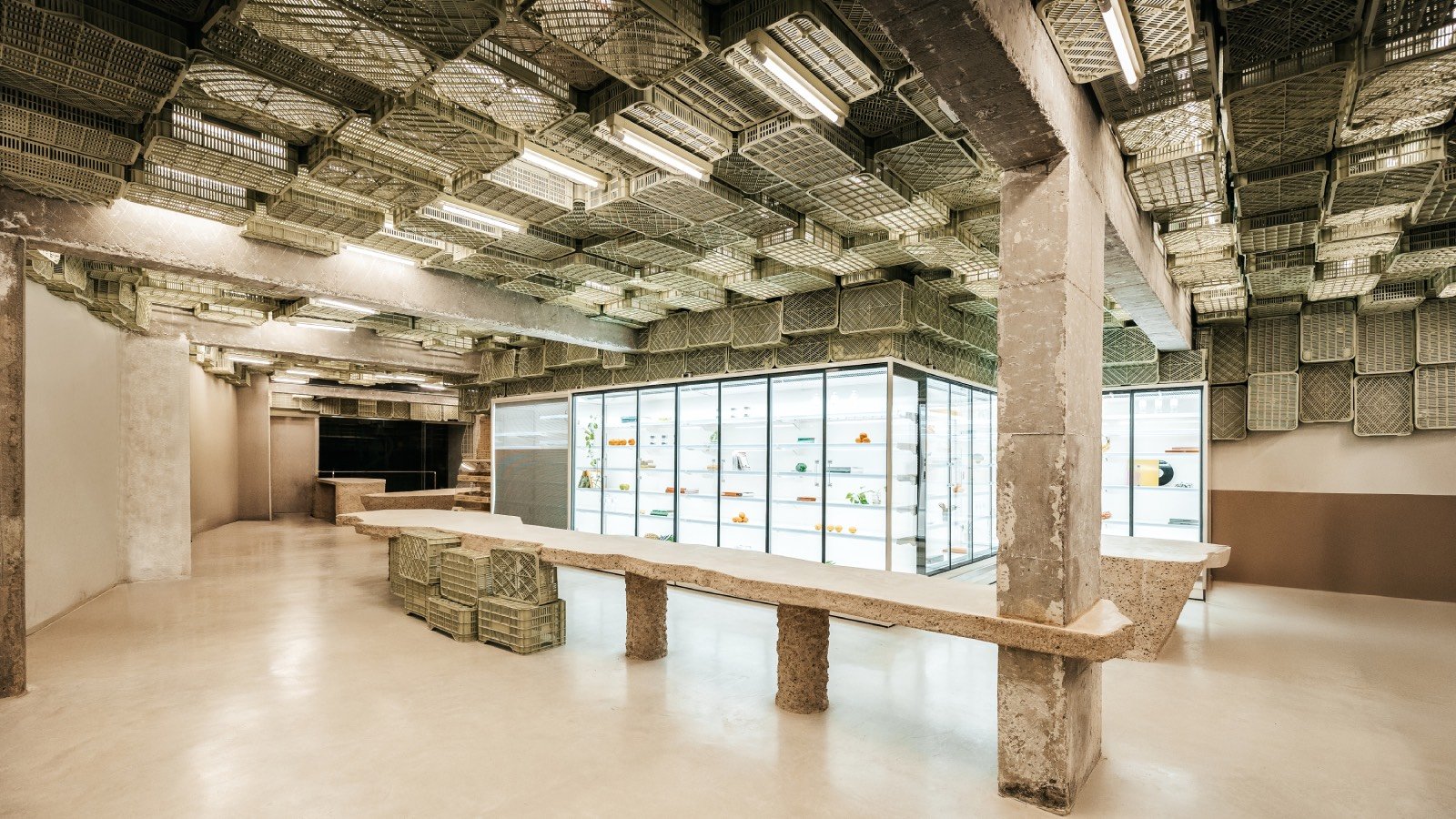 Minimal Studio Illuminates a Brutalist-Inspired Supermarket with Recycled Plastic Crates