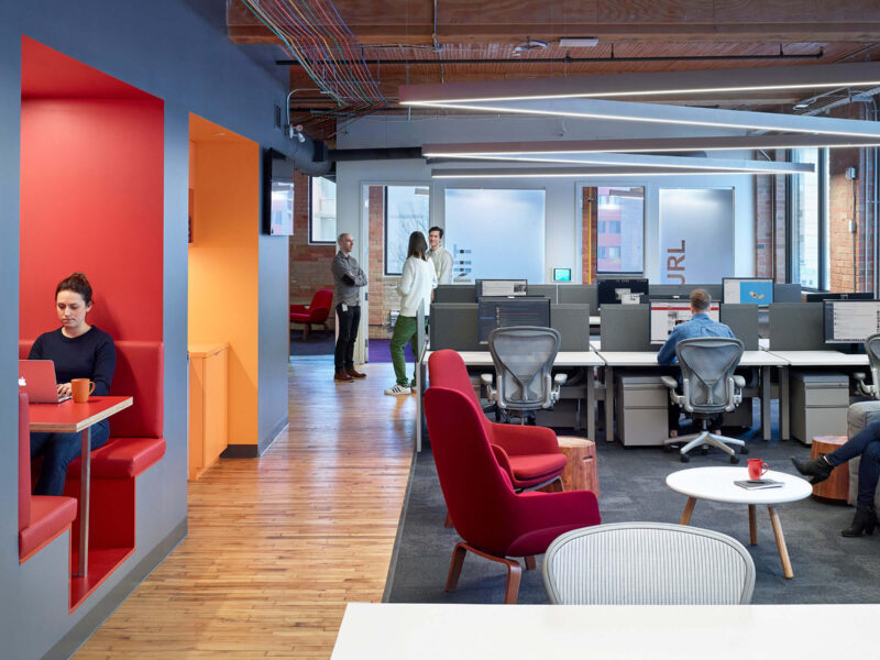 Roughly 15 per cent of the building, or 123,000 square feet, is devoted to employee well-being, and that’s evident from the moment one steps inside the One & Only Tower. The building’s 100-metre-long, 40-metre-high transparent atrium serves as a central social space. As workers filter into the atrium from street level or the offices above, the atrium will accommodate gathering and collaboration among employees in the company’s many departments.