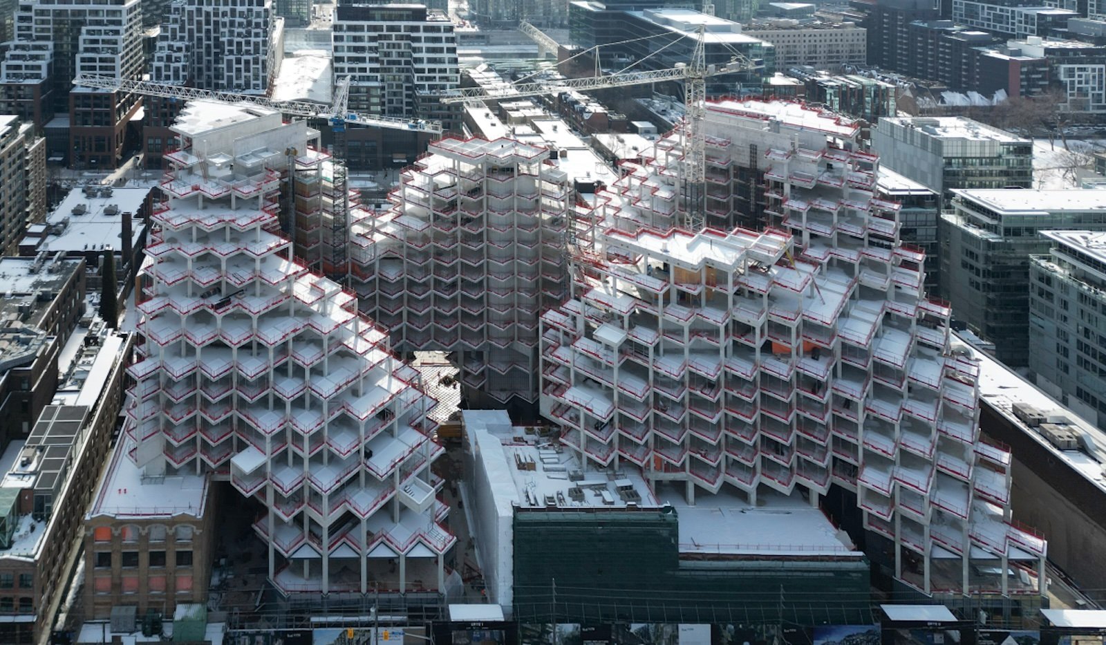 Much has been said and written about KING Toronto by BIG (including, obviously, in Azure). Over the past few years, the cuboid mountain has risen on one of the city’s most active downtown streets, inserting itself emphatically in a milieu of heritage buildings that today host trendy restaurants, boutiques and night-life locales. As the massing is completed and the curtainwall’s primary material – glass block – is beginning to wrap each unit, BIG’s ode to Moshe Safdie’s Habitat 67 looks as faithful to the original renderings as one could expect. Here’s hoping that the hanging plants also make their way across the peaks of the 500 residential units.