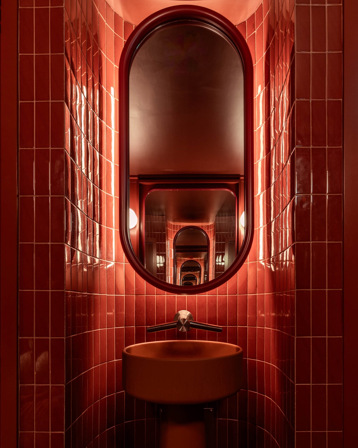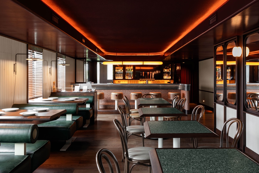 Upstairs, on the other hand, we enter the realm of gourmet calabrese sausage and sun-dried tomatoes. Dubbed the Low Rise bar and dining room, this elevated 40-seat second storey space nods to warm Italian trattorias with details like the mosaic-tiled bar and leather-cushioned bar seating, but again layers in fun futuristic flavour. After clustering mechanical systems around the perimeter of the room in bulkheads coated with high-gloss paint, MRDK introduced a glowing cove ceiling at the centre of the room that is lit in a sci-fi glow. Additional warmth arrives via a fluted In Common With pendant hung above the bar.