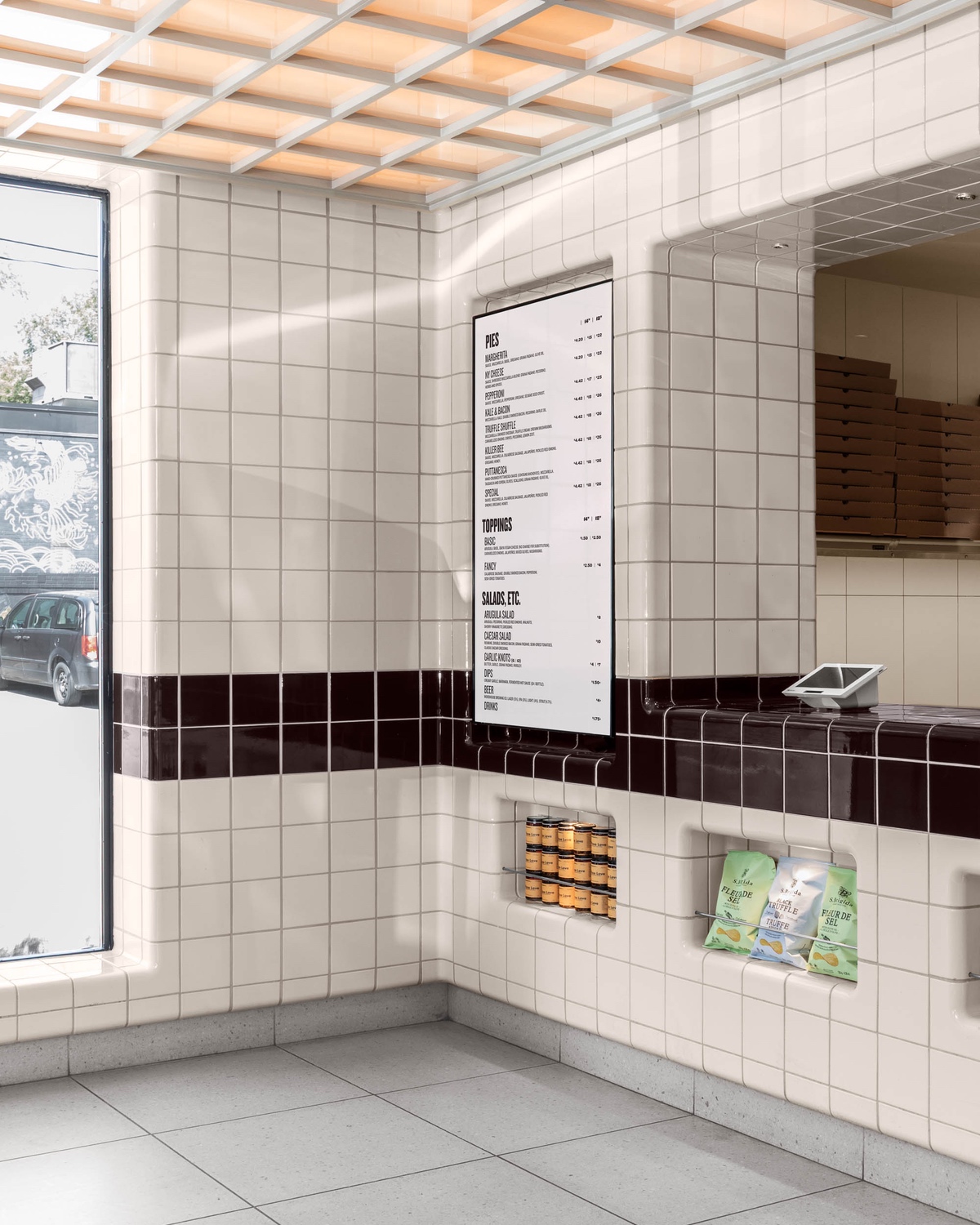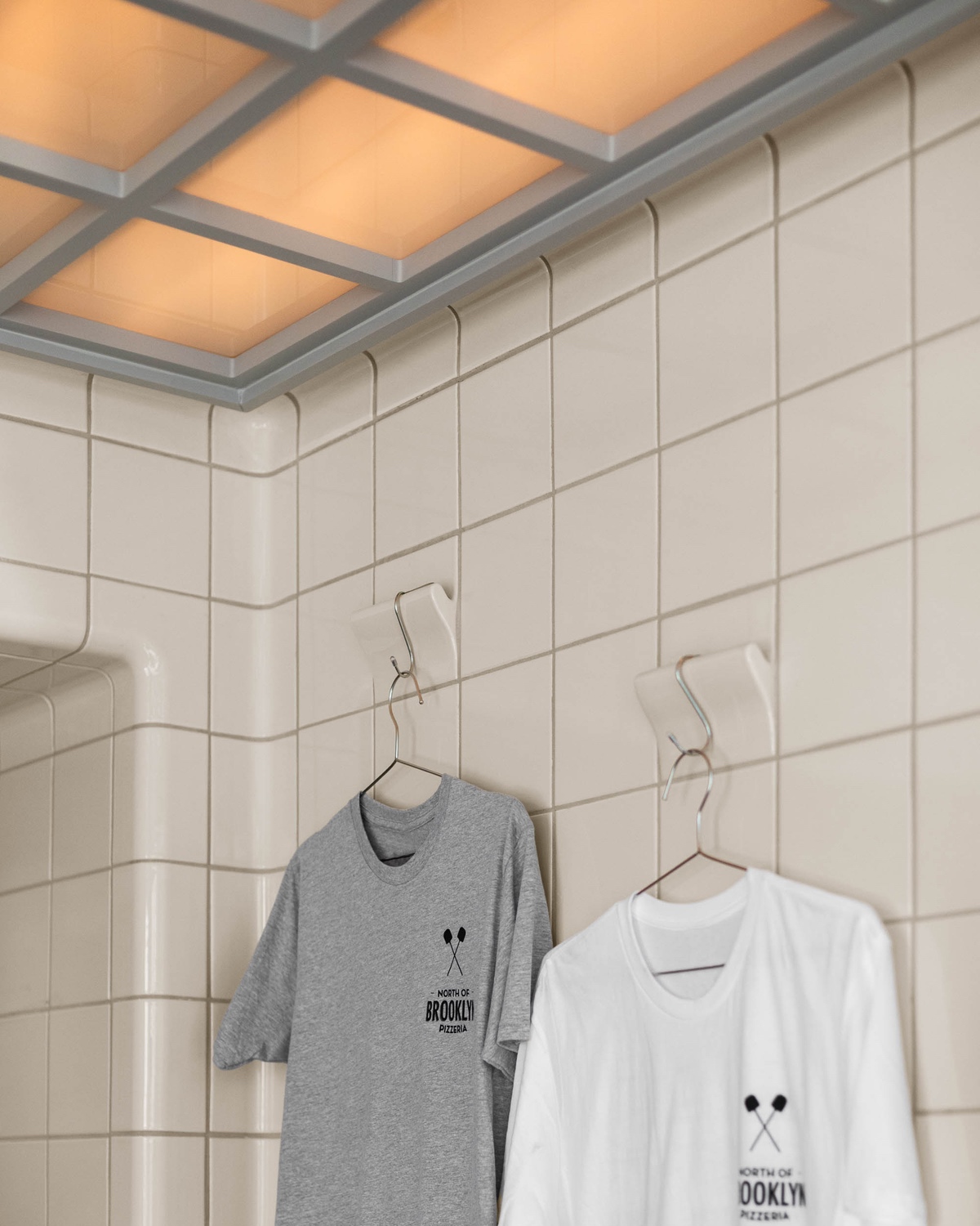 North of Brooklyn divides toppings for its custom pies into two categories — “basic” and “fancy” — and based on that classification system, this ground floor area (which also houses the pizzeria’s kitchen) sticks to tasty but unfussy ingredients. In this case, instead of basil, olives or pepperoni, it’s DTILE molded tiles, which wrap around the entire room and even seamlessly curve into a row of counter display niches that showcase sauces and sodas. In a few cases, the tiles even fold outwards to create clothing hooks for restaurant merch.