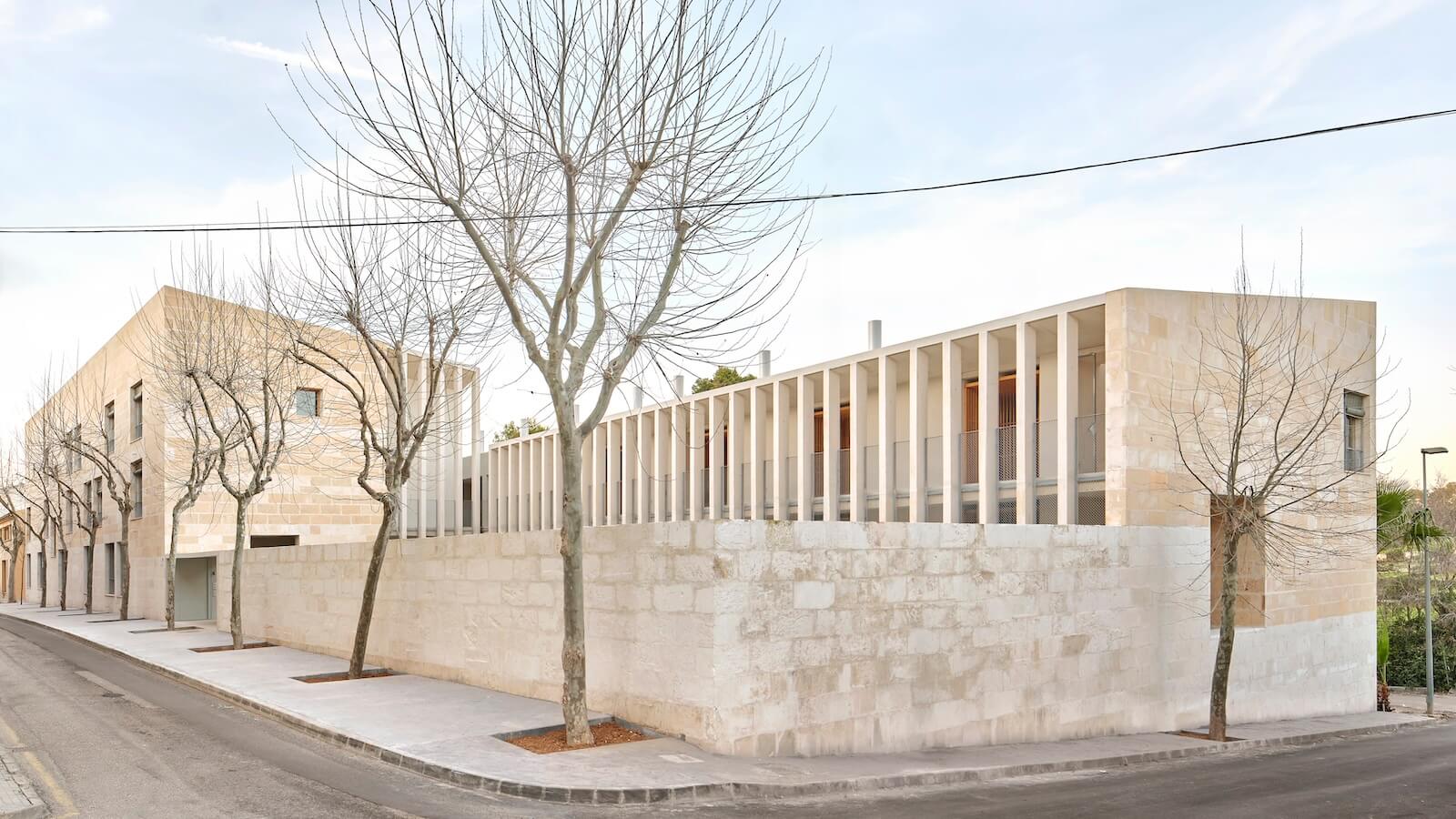 In idyllic Son Servera on the island of Mallorca, Barcelona firm Peris+Toral Arquitectes has created an affordable housing project that feels of a piece with its surroundings. Its two buildings feature self-supporting facades composed of ashlars (square-cut masonry units) made of marés, the sandstone and limestone specific to the Balearic Islands. Positioned in parallel, yet staggered on the plot, the dual volumes break up the form of the whole in order to render it in scale with its broader context. They also negotiate uneven terrain.