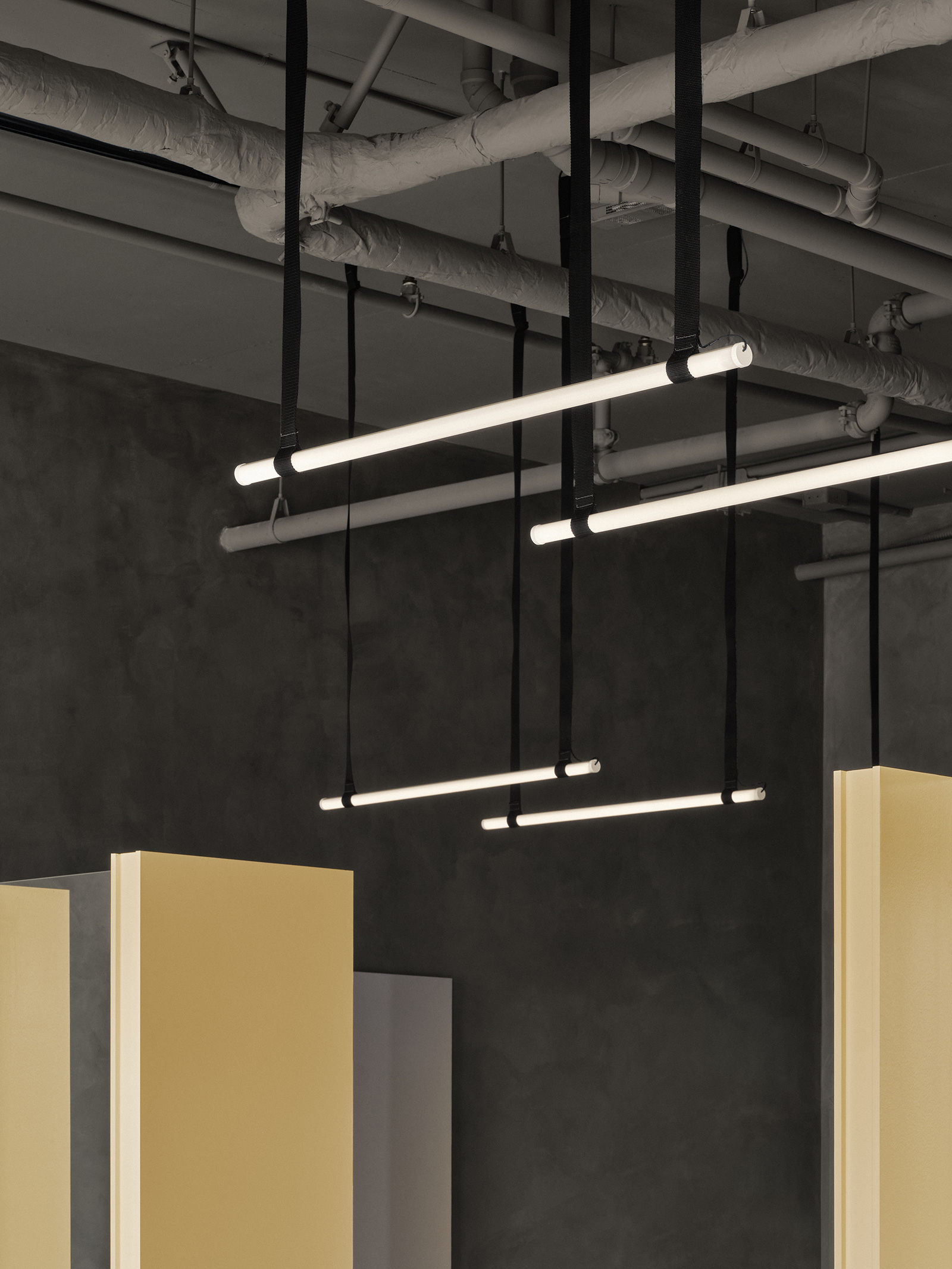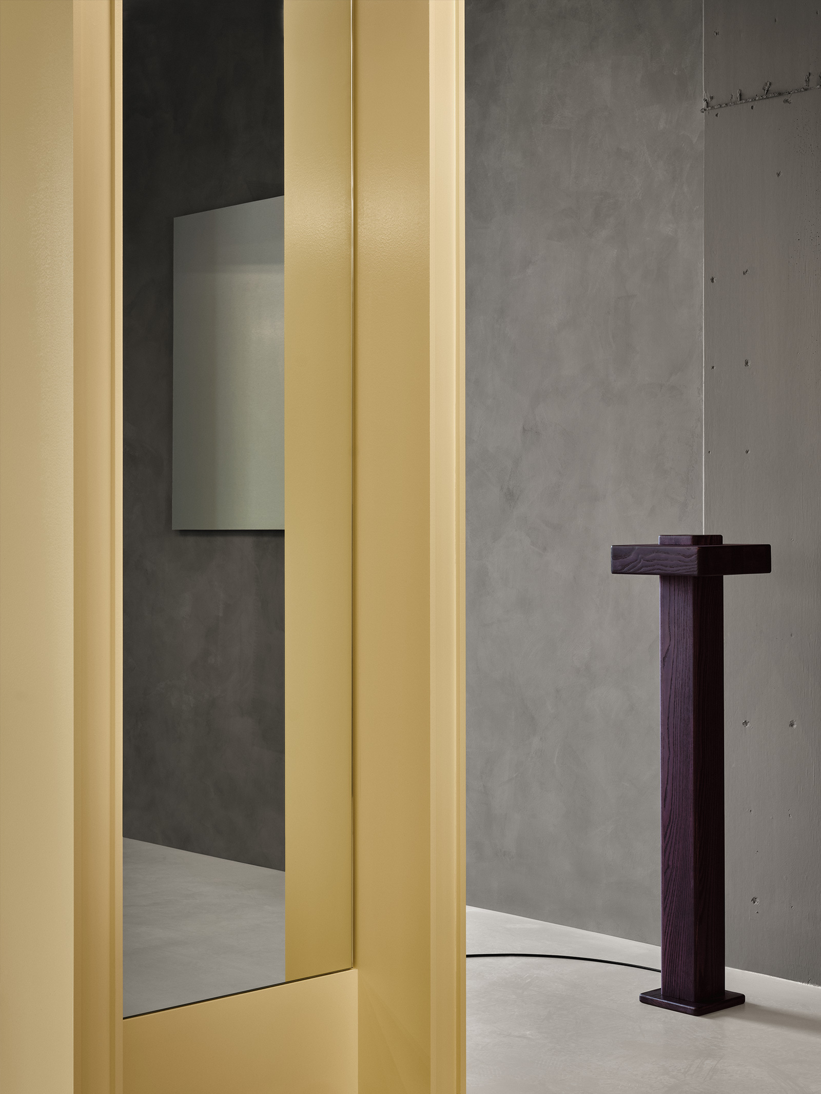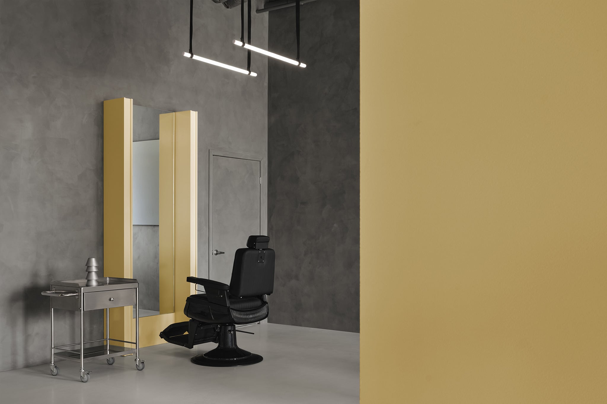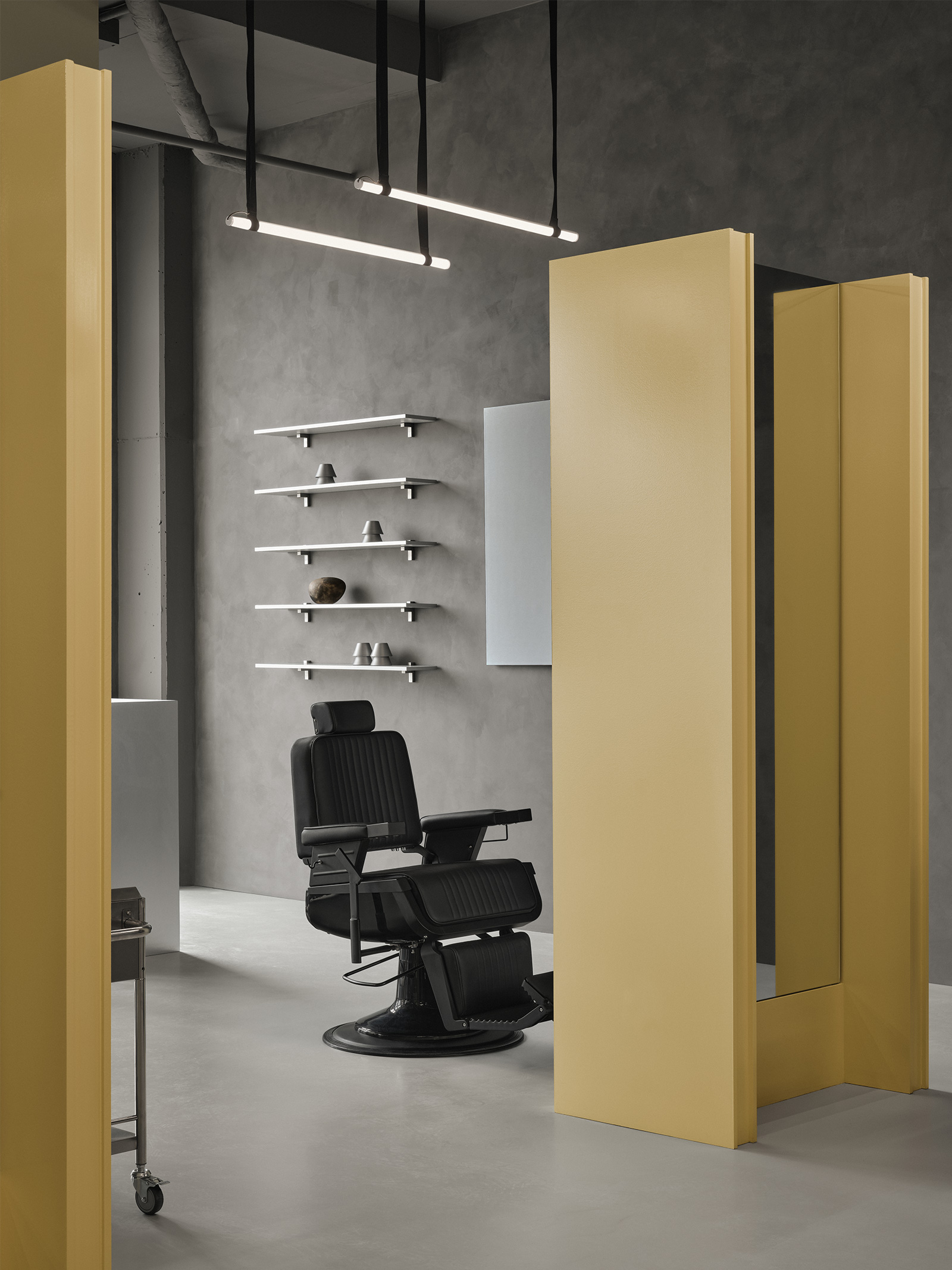 To build this identity, Montreal design studio By Lemoignan started by abandoning the classic red, white and blue barbershop palette entirely. Other touchstones of the grooming salon typology — namely, checkerboard floors, wood cabinetry and cluttered wall decor — have also been trimmed away. In their place are pared-back, slate grey lime-wash walls and matte epoxy flooring that contributes to a primordial, cave-like environment. From there, contrasting elements introduce pops of butter yellow and deep black, while a strong focus on clean lines and exacting forms echoes the precise handiwork of the professionals on site. Deftly reflecting the barber’s transformation from a pseudo-surgeon into an artist, the overall outcome is an avant-garde setting that could easily pass for a contemporary gallery.
