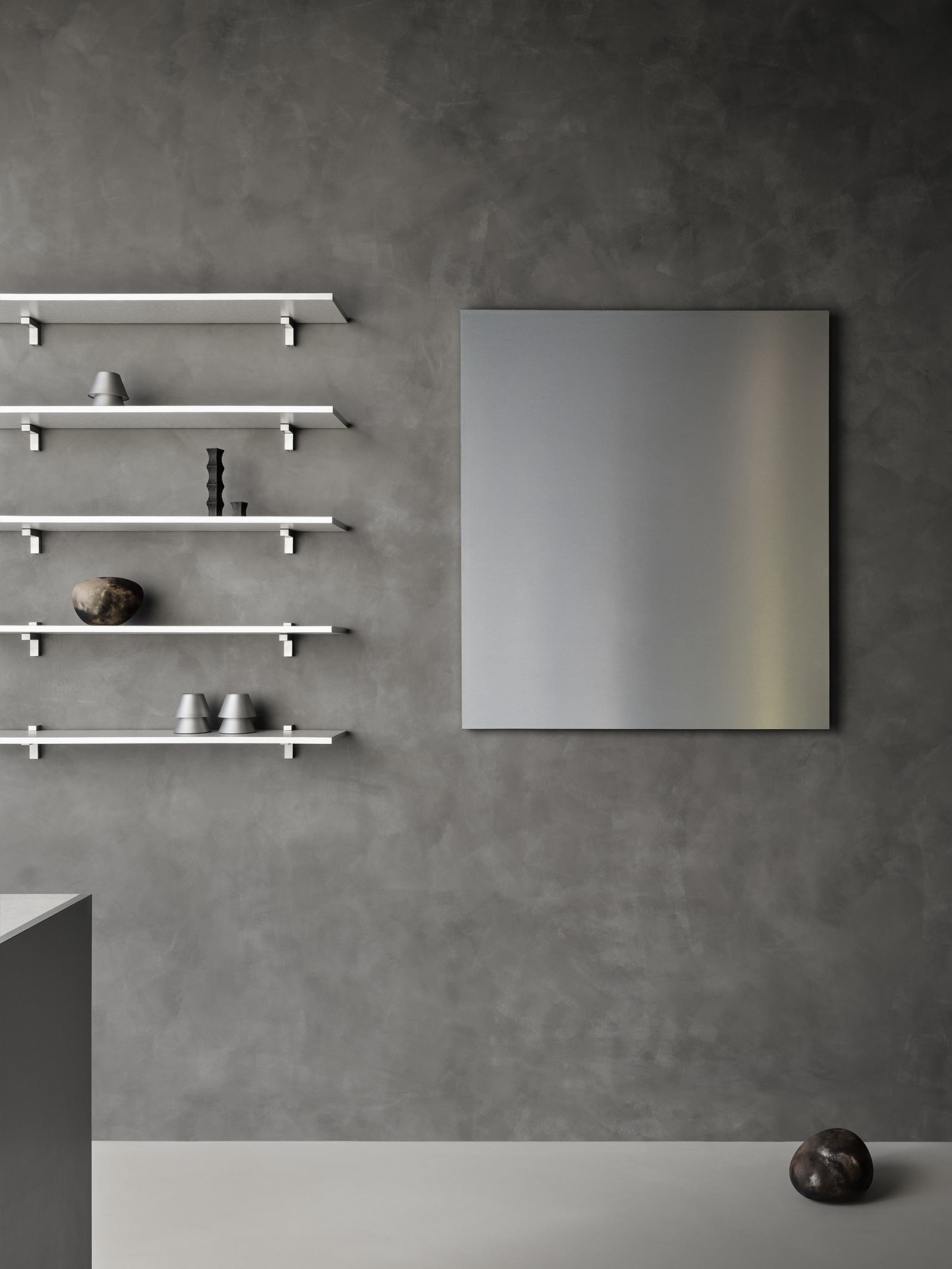 Throughout both areas, stainless steel elements (including a series of hard-edged wall-mounted shelves) evoke razor blades and scissors — two key tools of the barbershop trade. And there is still one nod to the profession’s origin story, too: Each station includes a steel cart that resembles an old medical trolley, accented by a small aluminum table lamp designed by Sauvé Morissette. Of course, there won’t be any bloodletting here — instead, Salon Volta promises to improve one’s mental health with good conversation and a confidence-boosting haircut.