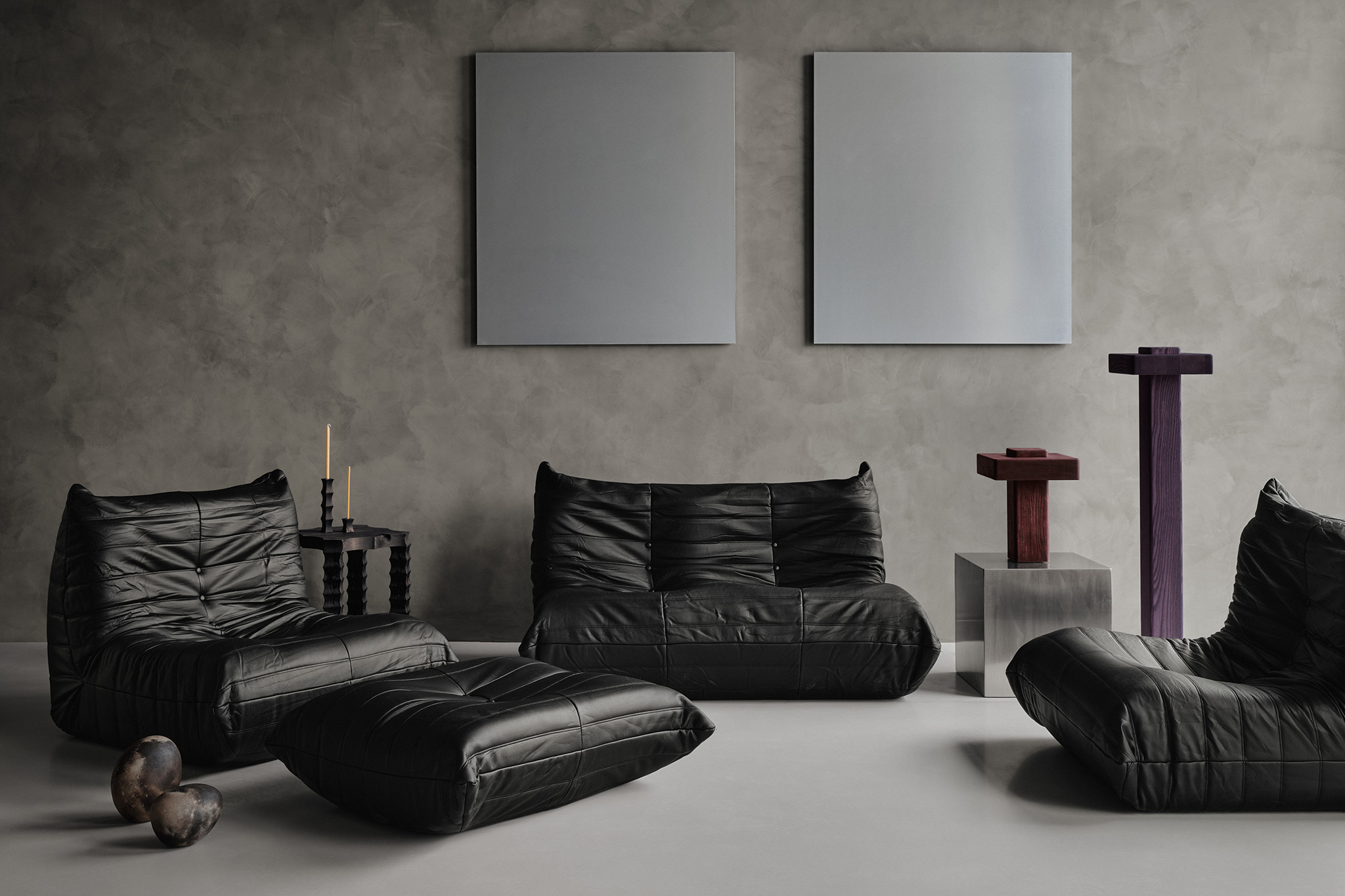 This emphasis on creative expression continues with the project’s sophisticated furnishing selections. In the lounge zone, a trio of black leather Ligne Roset Togos join statement-making contributions sourced from Montreal’s thriving creative scene. Alongside a charred pine side table with serrated legs from Igor Zigor’s Spiky series, the area showcases totemic lighting from Pillar, a collaboration between Studio Super Sunday and By Lemoignan itself. (Both Pillar and Spiky were also standouts at Ensemble, a recent exhibition held during Toronto’s 2026 DesignTO festival this January.) Together, this vignette lays the foundation for a relaxed communal waiting area where clients feel encouraged to strike up conversation with one another — perhaps by discussing the many sculptural designs they’re surrounded by.
