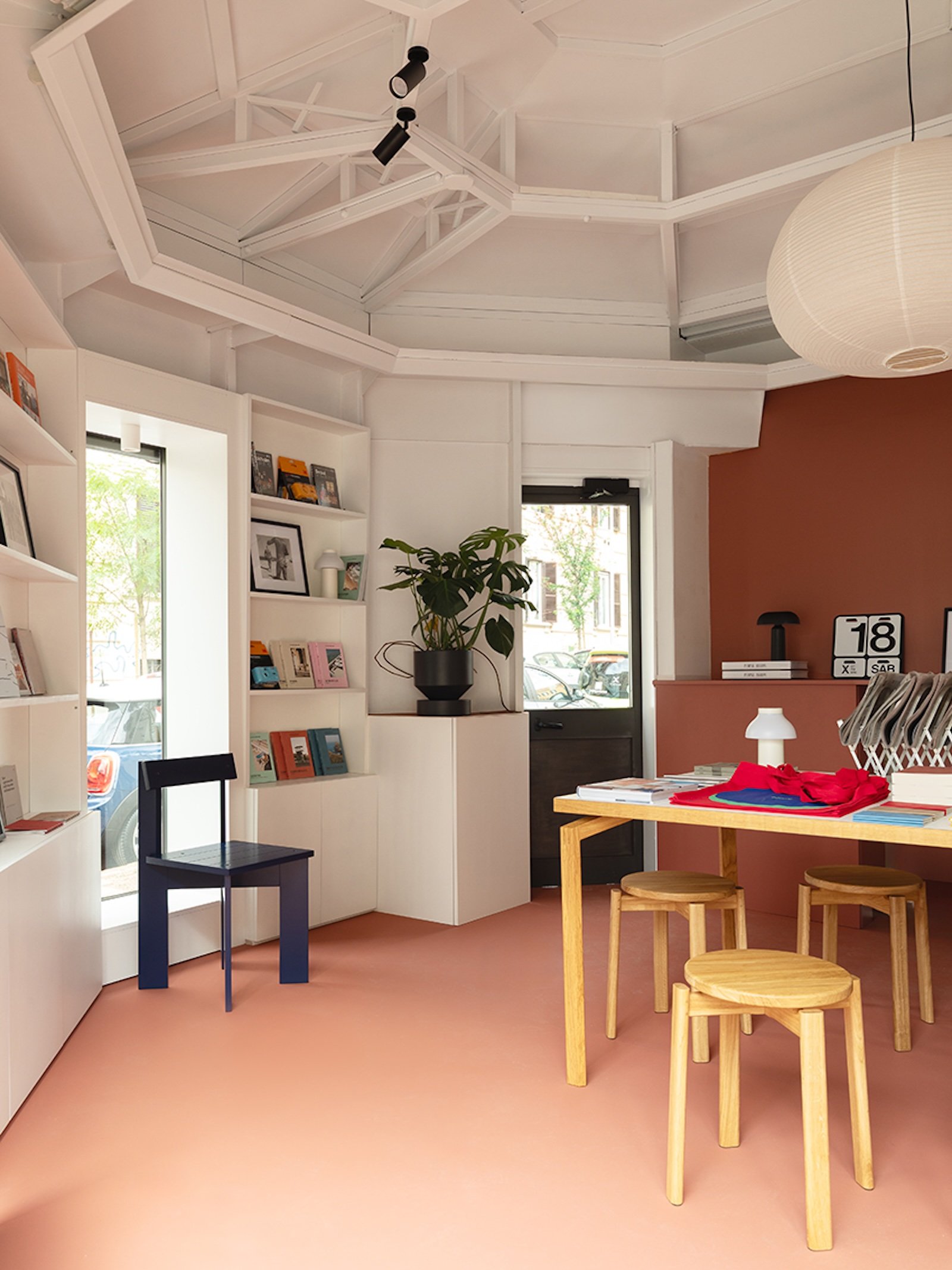 Imagined by Orefice as “a cultural outpost, a revitalized urban landmark and a gathering place,” Santedicola was styled in collaboration with the Roman design studios Dispensabile and Cantiere Galli Design. Together, they’ve remodeled the kiosk with a refreshingly open interior (edicole come in many forms and sizes, some only big enough for a shop-keeper, others capacious enough for patrons to step into). White-lacquered wood shelving, terracotta-toned Forbo vinyl flooring and elegant design pieces – including a Magnus Olesen table, Hay’s Chisel lounge chair, stools and chairs by Audo Copenhagen and Ferm Living and lighting by Hay and Artemide – render it an impeccably appointed living room.