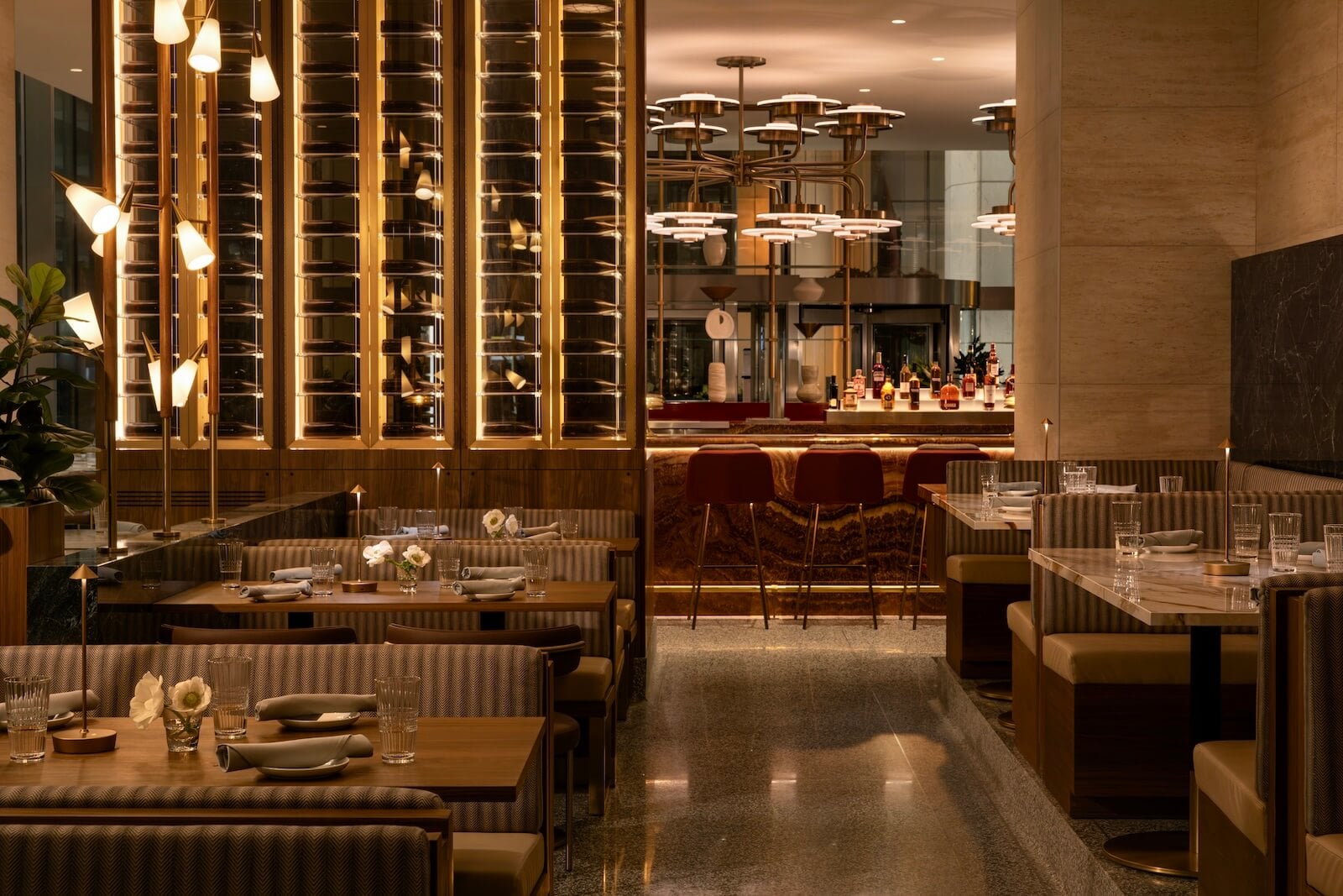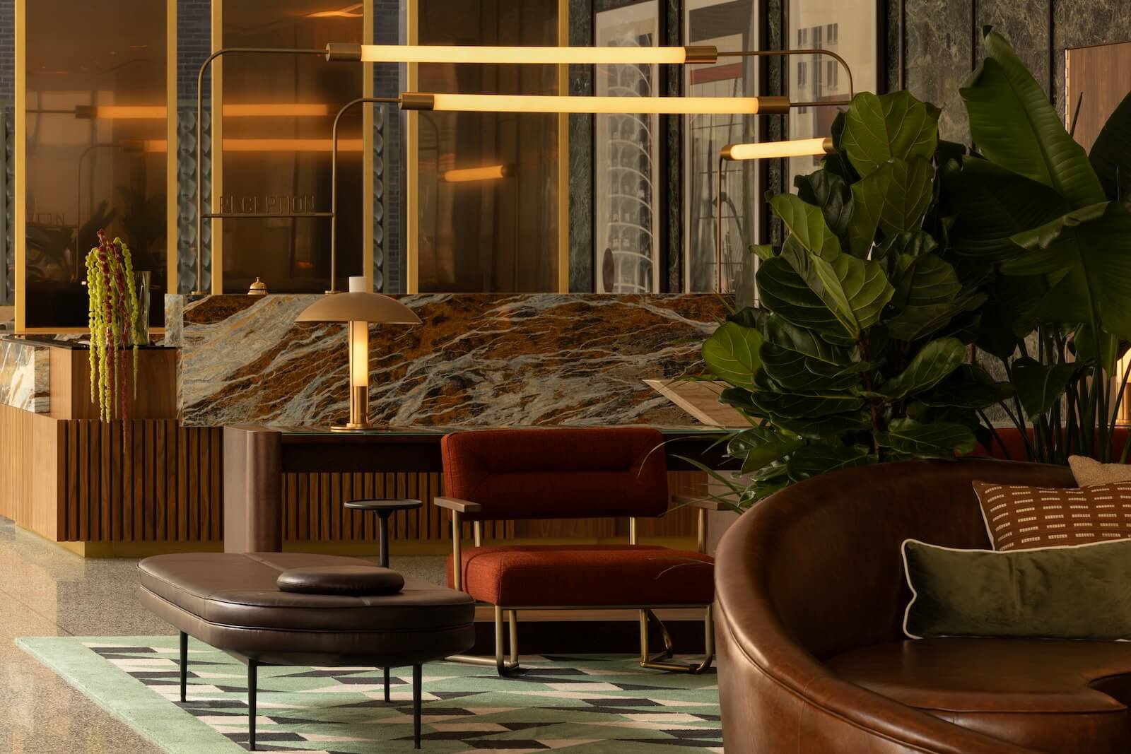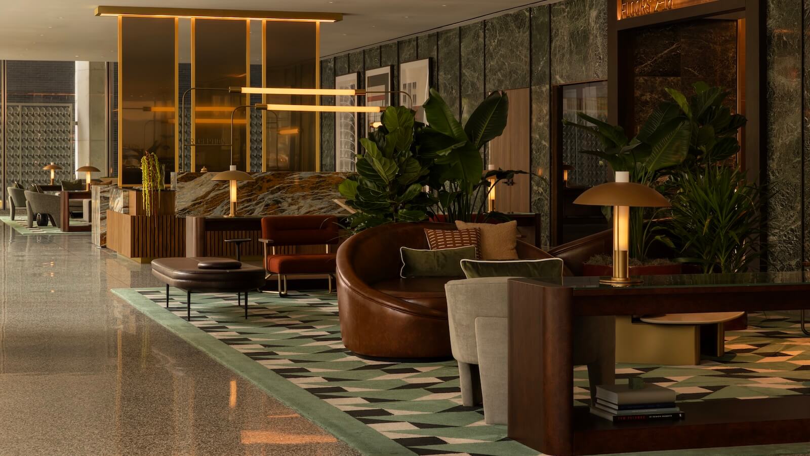 That experience begins in the lobby, which unfolds less like a buttoned-up office entry and more like a hotel or members’ club, with Solette, a 200-seat restaurant featuring curved, tactile seating and a palette of Verde Alpi marble, terrazzo, walnut and brass. The material choices, stemming from the building’s original expression, are refined and extended throughout the amenity spaces above, creating continuity in celebration of the 1960s, as well as the proportions, permanence and symmetry of New Formalism.