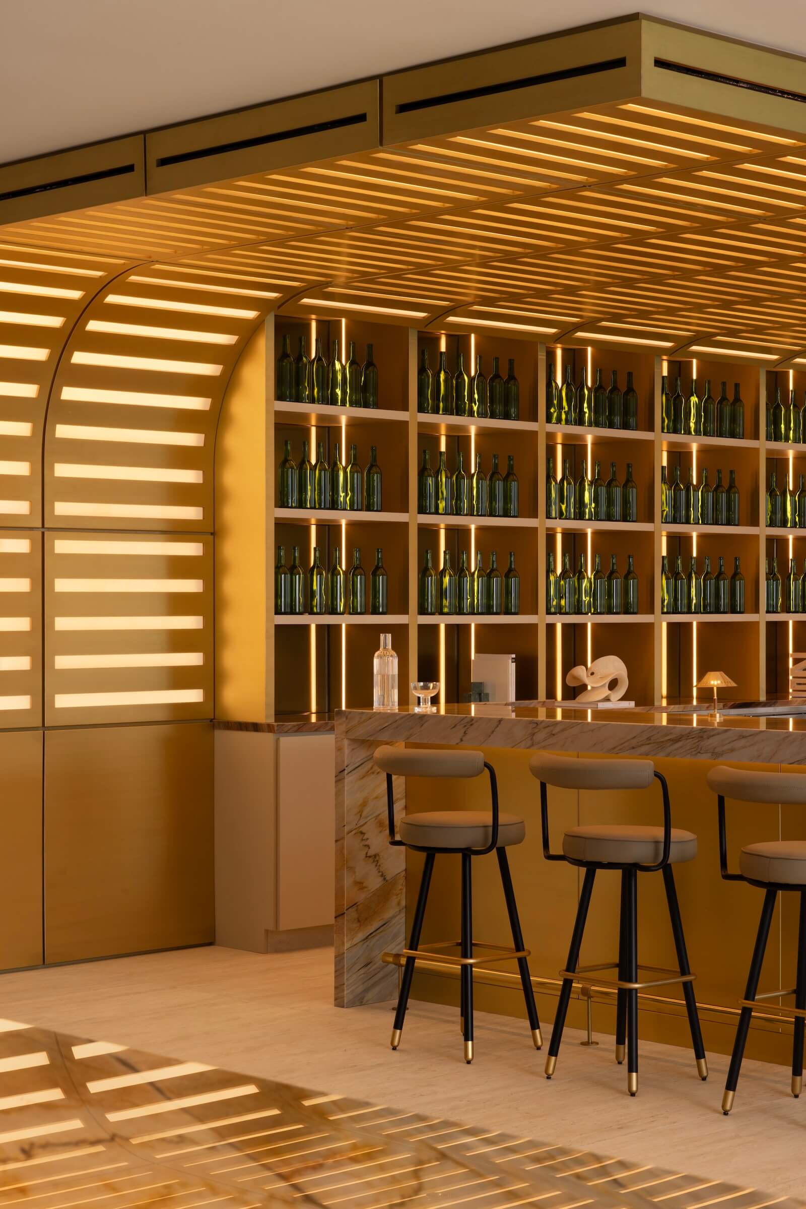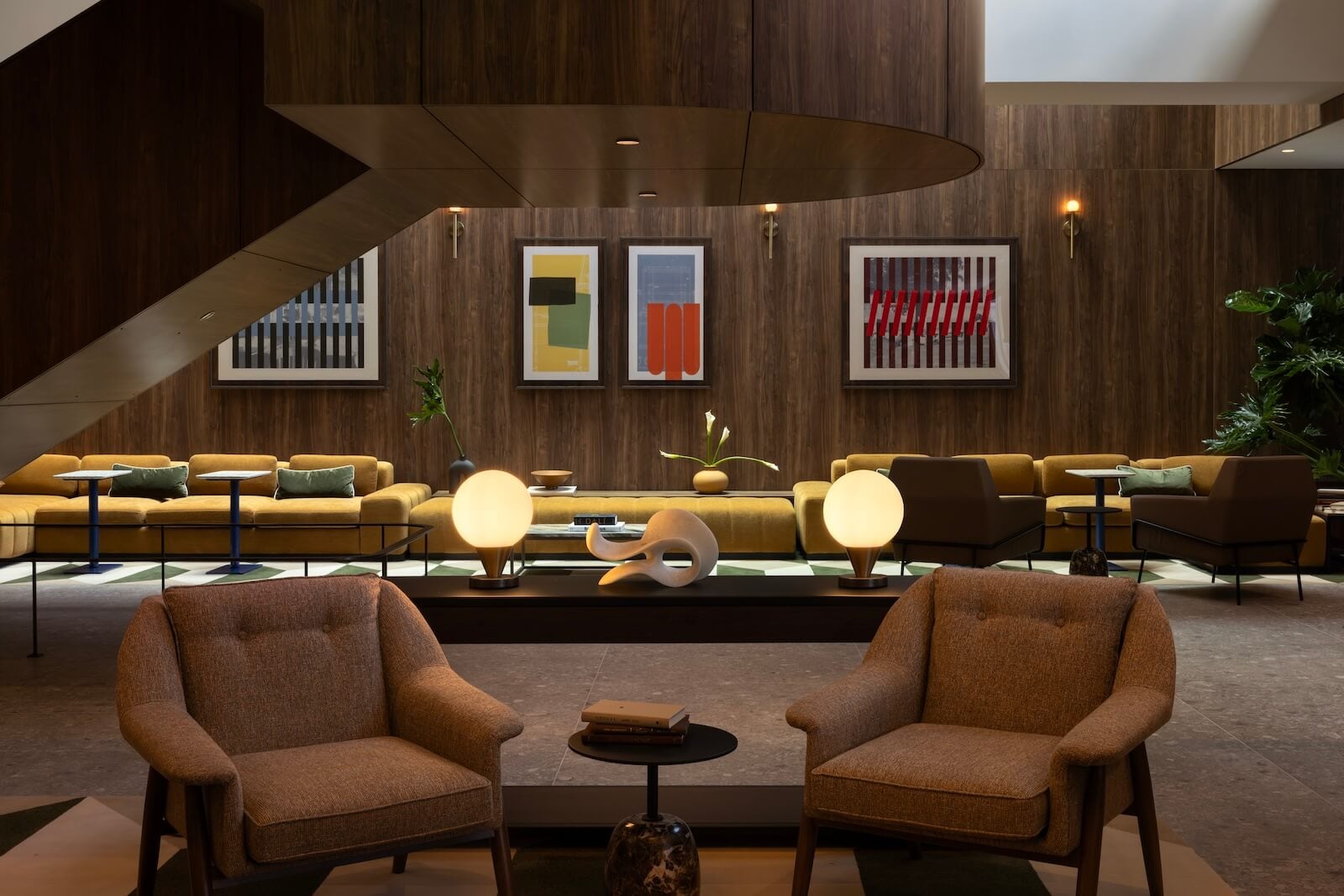 “The idea was to extend that language in a way that felt consistent and current,” Stanghetta says. That meant working with warm tones, layering, and imparting details that carry across different spaces. A restrained use of colour acts as an organizational tool, while quiet references to mid-century phenoms like Gio Ponti and Ettore Sottsass emerge through pattern, artwork, and furniture. Lighting, varying in depth and intensity, further delineates each environment.