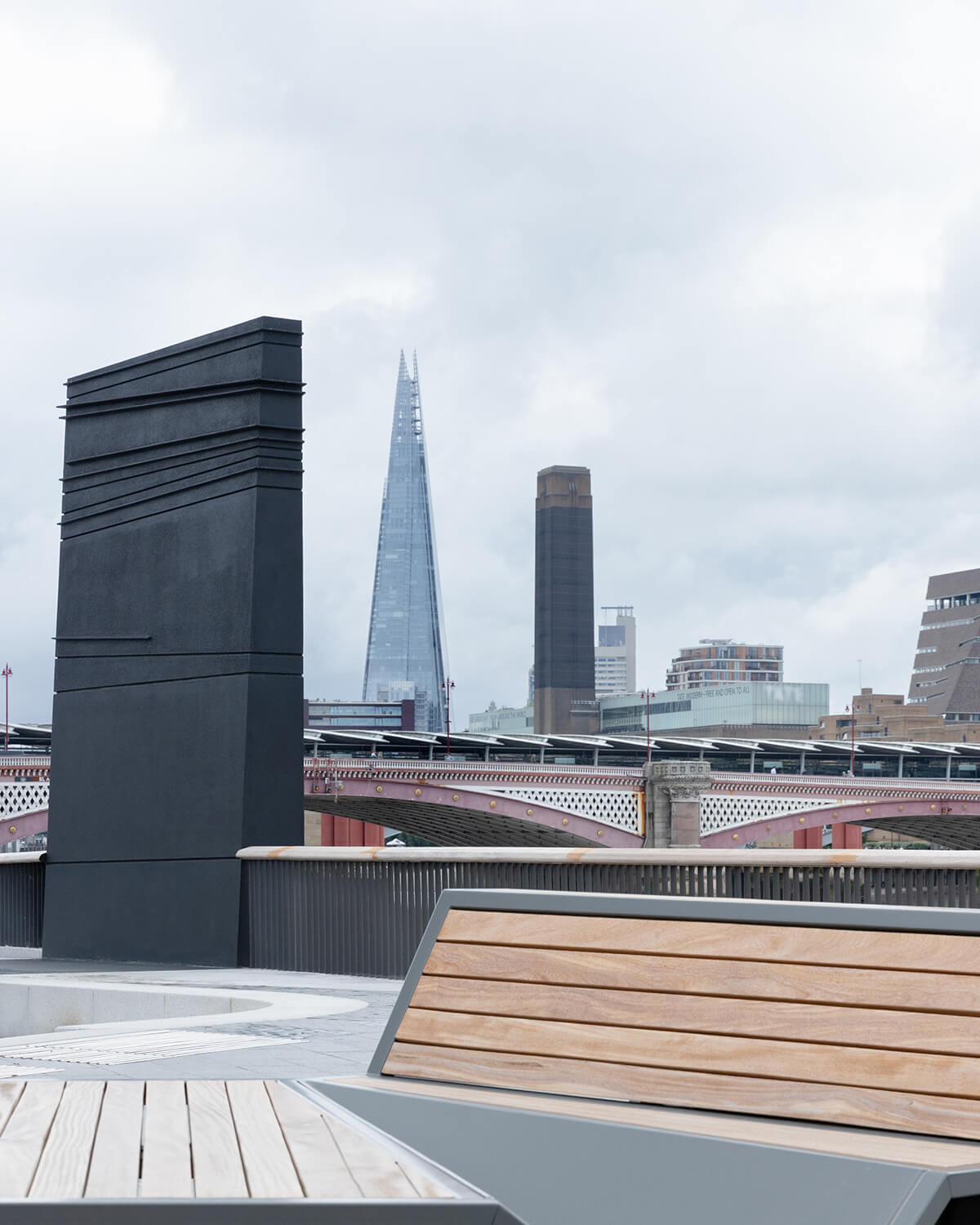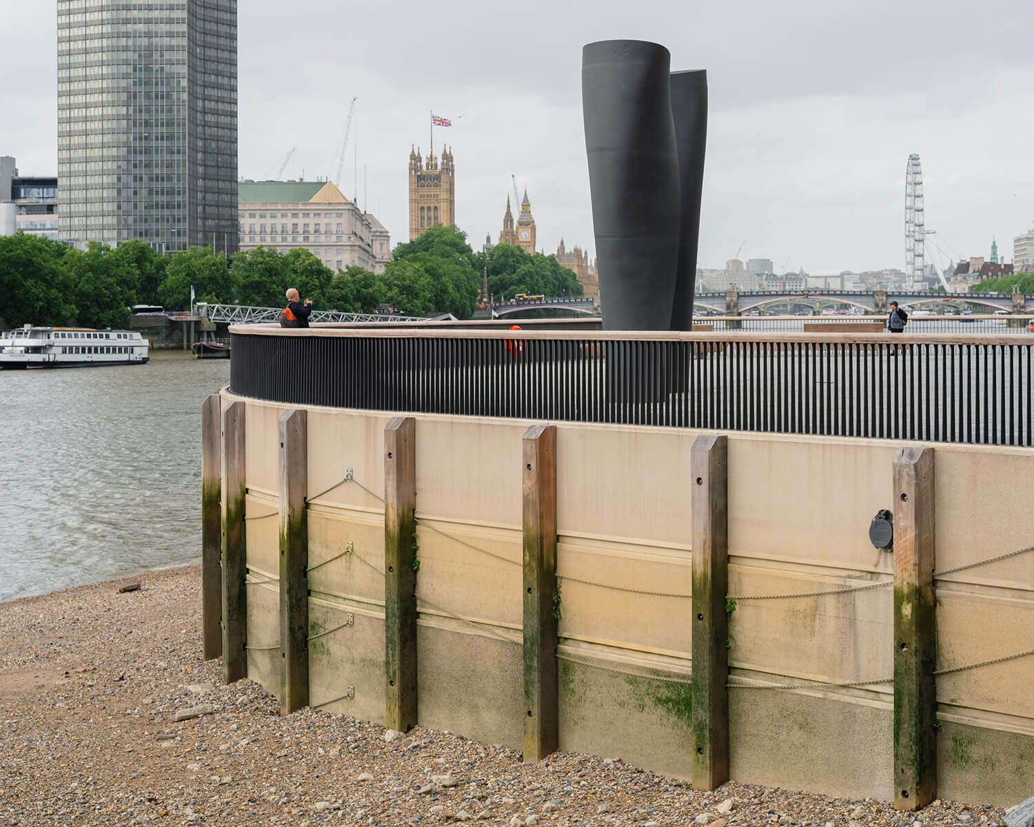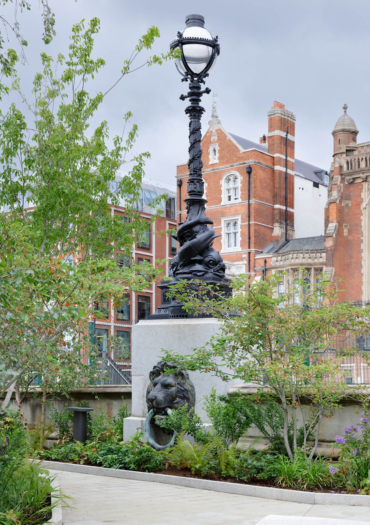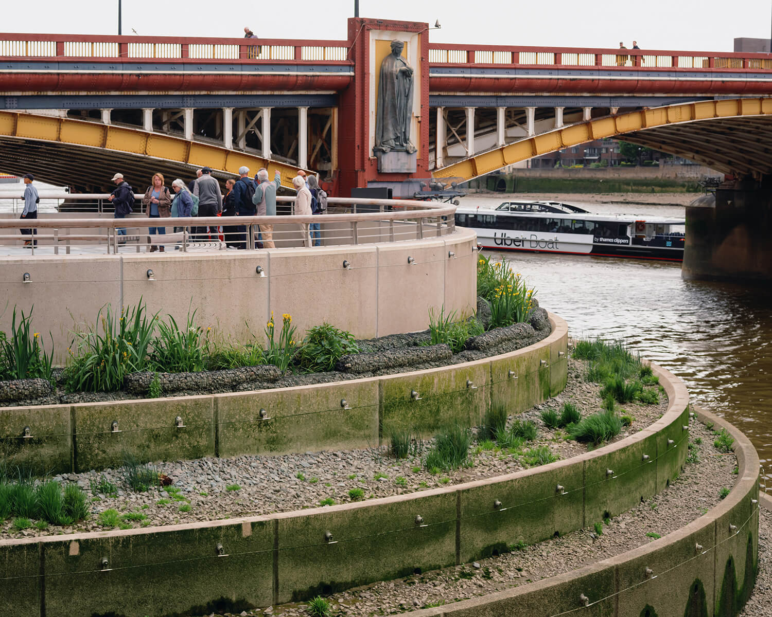 The design language of Tyburn Quay, meanwhile, draws from the plane trees, historic lamp standards and elegant stonework of the Victoria Embankment. A new riverside terrace brings visitors closer to the water than ever, with viewing platforms and lower foreshore zones. These moves, along with open balustrades that allow for clear views, are designed to encourage engagement with the river. “It was a deliberate move to allow the public to come down below what the flood defences are. If you had a perfect scenario of high tide and wind, and maybe a boat going past, you may actually get water lapping onto that level,” explains Neskovic. “All of the designs are conceived in such a way that they could increase the flood defence levels in the future, so it’s also building in resilience.”