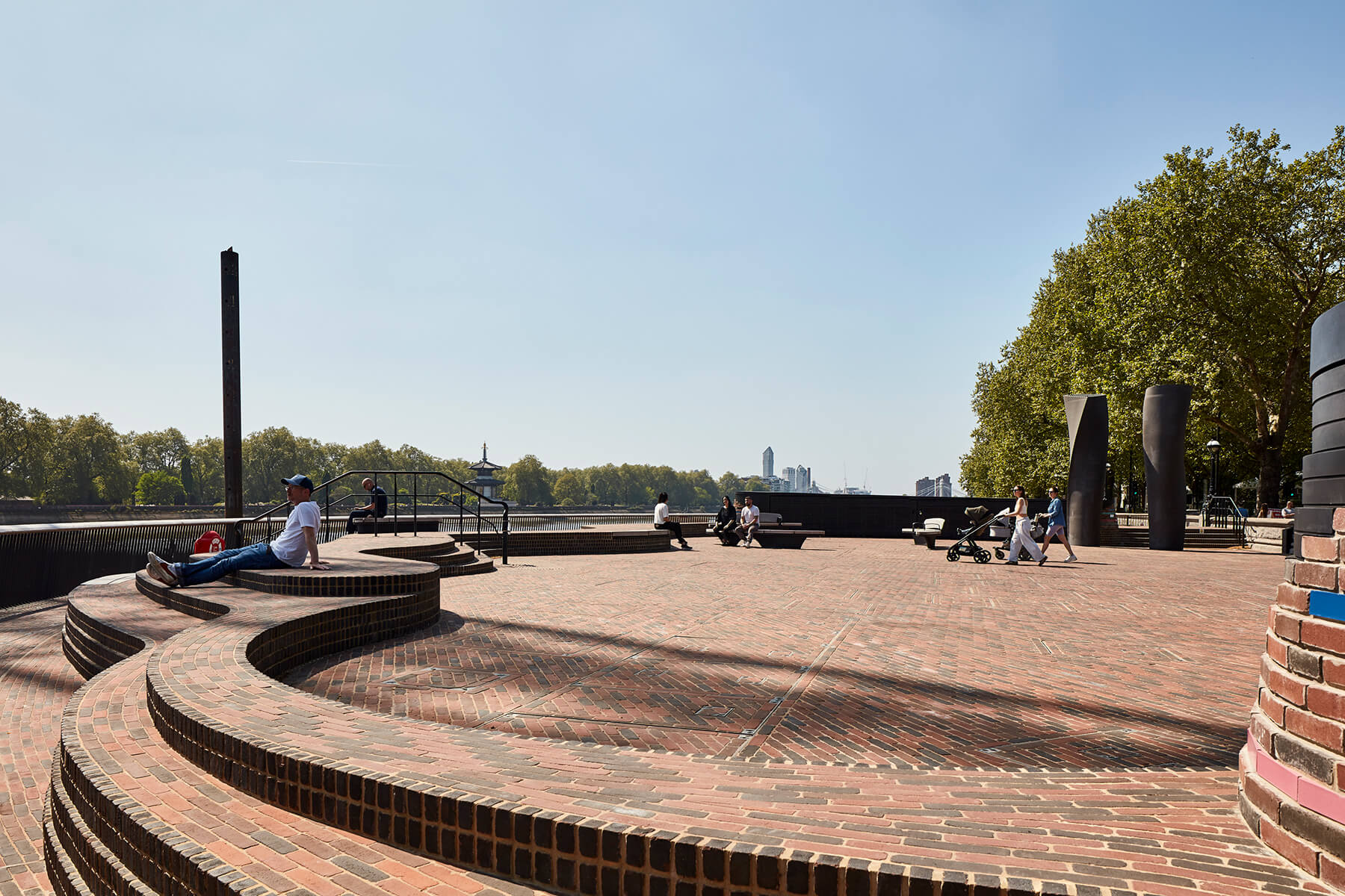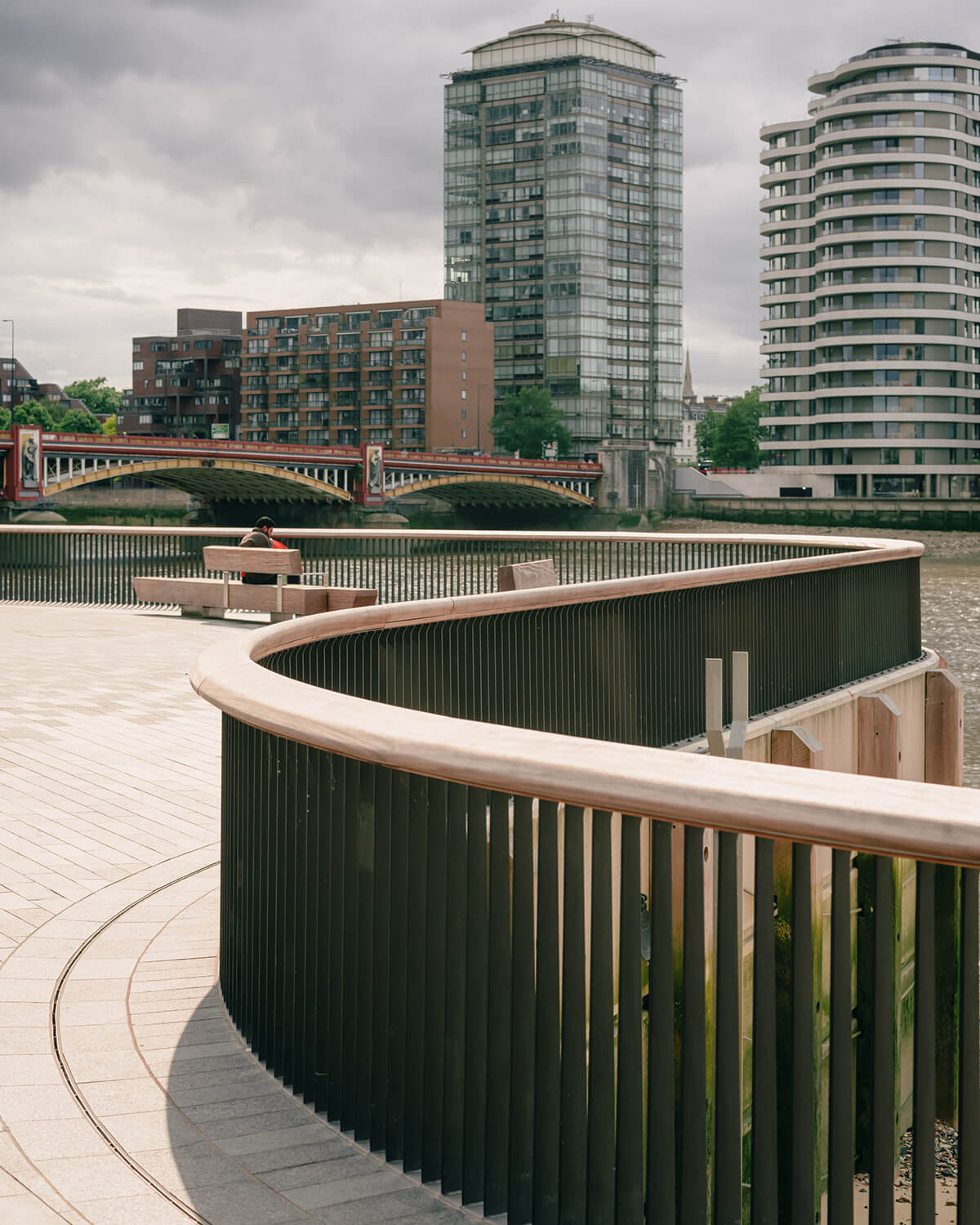 Though conceived as a single project, its success lies in how each site creates a distinct sense of place attuned to its context, which varies dramatically along the river. “Even the geology changes, going from rocks to chalks to sands and silts and clays,” explains Neskovic. At the Chelsea Quay, for instance, traditional clay bricks create an organic form that references Bazalgette’s original Victorian tunnels, while also nodding to the materiality of the embankment wall. Here, the lower walkway, complete with intertidal planting zones, allows visitors to approach the water’s edge.