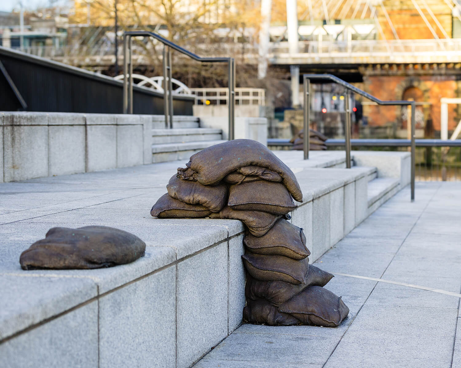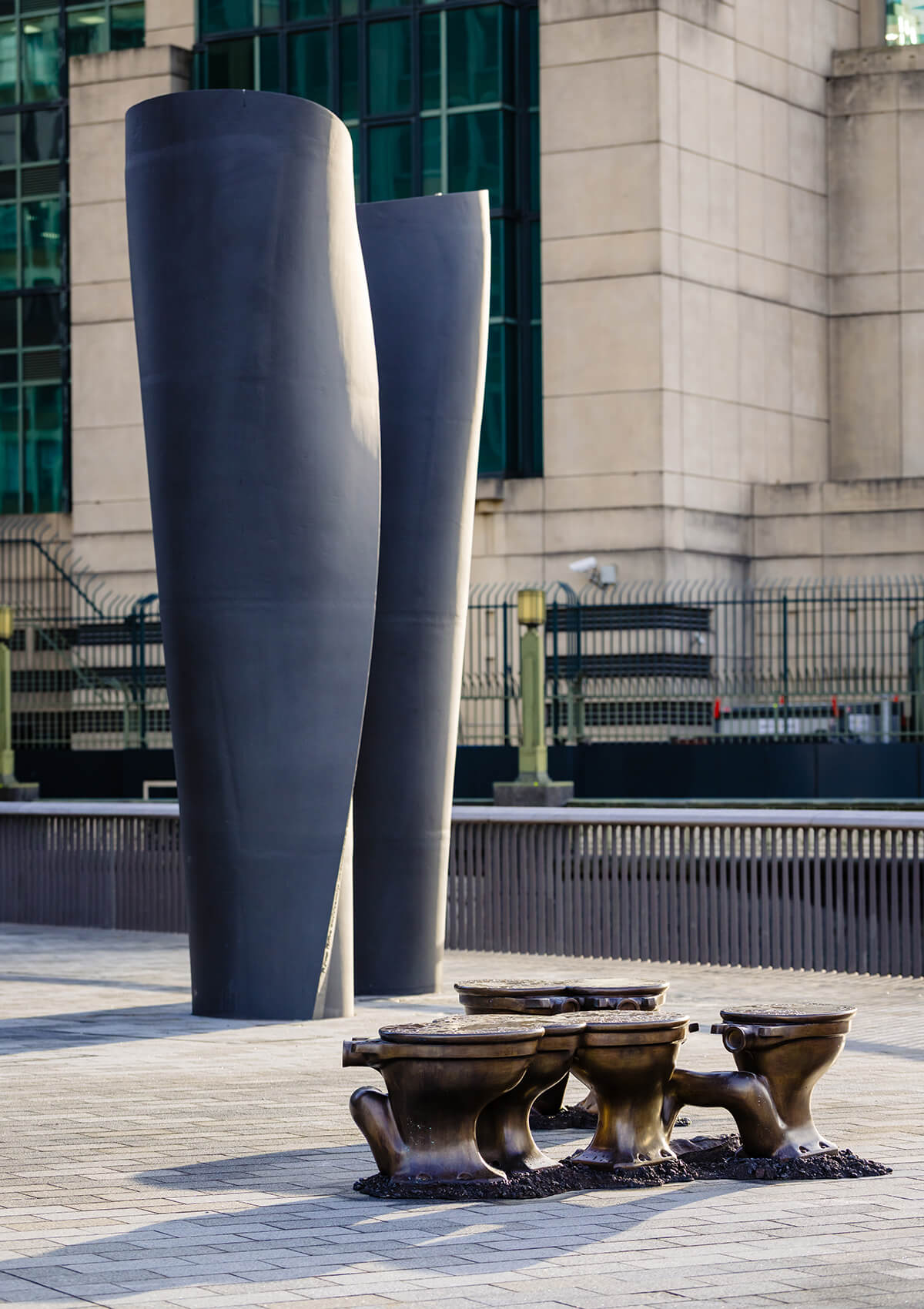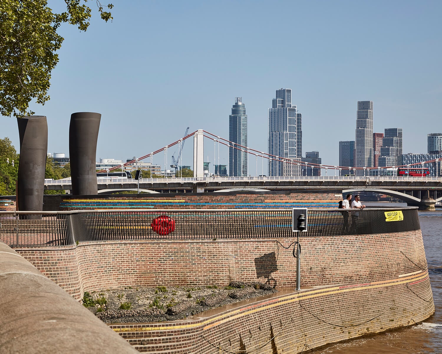 At Bazalgette, Nathan Coley’s “Stages” sculptures do triple duty — framing views, creating social spaces and forming part of the river’s flood defence; at Tyburn, Richard Wentworth’s bronze-cast “sandbags” cascade down the steps, nodding to the city’s long history of flood defence; and at Effra, playful bronze benches reference both the sewer and Royal Doulton, while lighting features shift in colour with the Thames tide to animate the quay. In some instances, Hawkins\Brown was tasked with situating the works in line with the artists’ intent; in others — as with Coley — the collaboration more directly shaped the design.