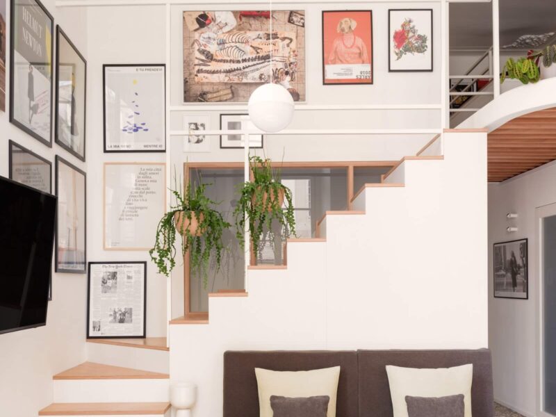 The centre of the home features an open-plan space with a living room, dining room, and kitchen, while a staircase at the back leads up to the bedroom and bathroom on the mezzanine – a floating white volume that pops against the wood tones. “The choice of changing material aims to blur its presence or make it appear lighter,” say the firm, “as if it were a piece of cotton floating in space.”