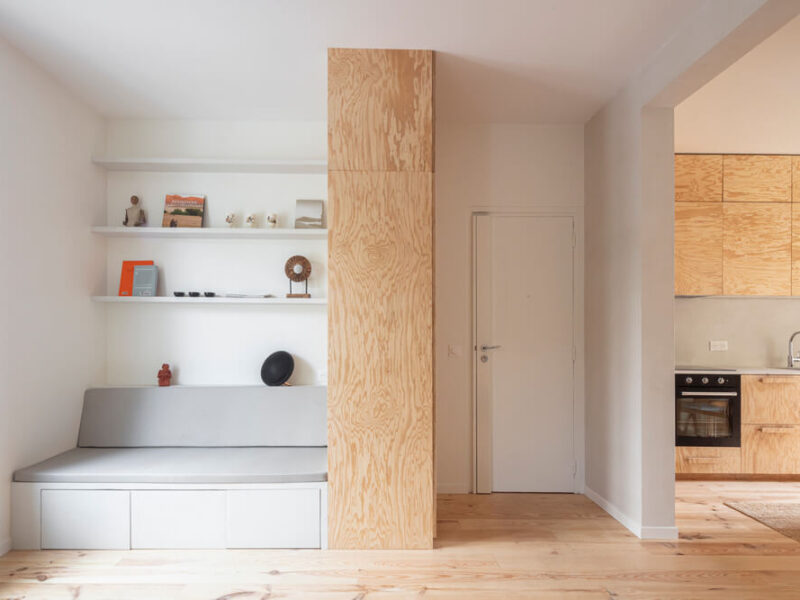 Instead, for Houses of Cards the firm decided to complement the granite panels with coloured concrete ones (wood siding is also used). The hues that they chose for the concrete was a way to reflect the sisters’ heritage: their mother is from India and they love the vibrant colours that her country is known for. While both houses are 200 square metres, the Cat House (named for the sister who loves felines) is orthogonal in form and the Dog House (named for the dog-loving sibling) is radial. What Elastico Farm found was that the orthogonal house required transversal metal bracing to withstand seismic forces; they designed the radial form as a response – its very shape makes it earthquake proof, allowing them to eschew extra bracing. Inside the homes, the panels become part of the living space, both a material finish and a furnishing. “It’s something more than just a wall. It decorates the house with its own structure,” Pujatti says.