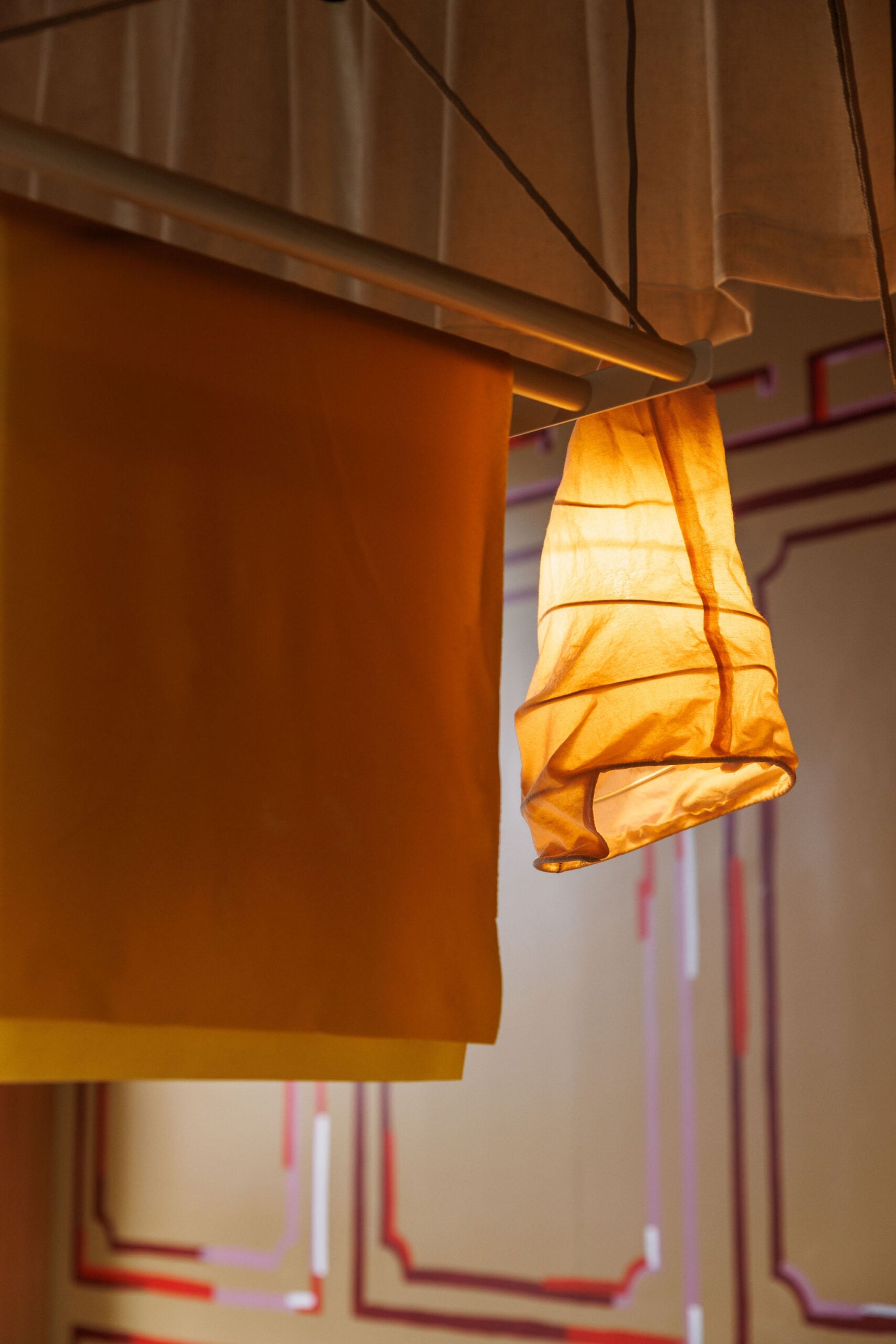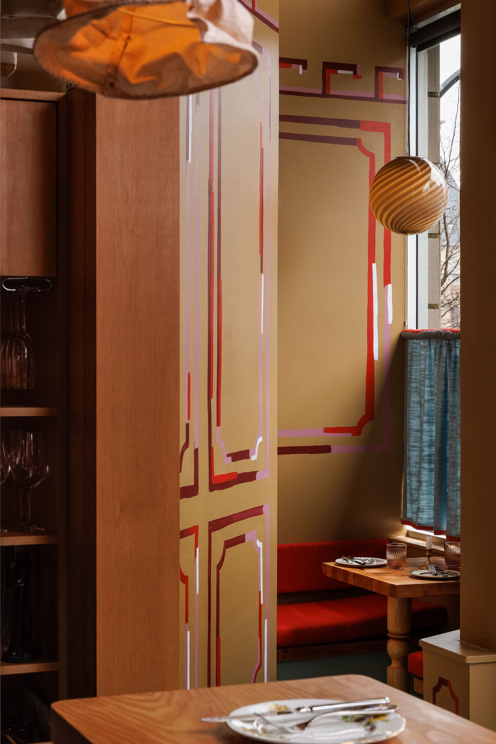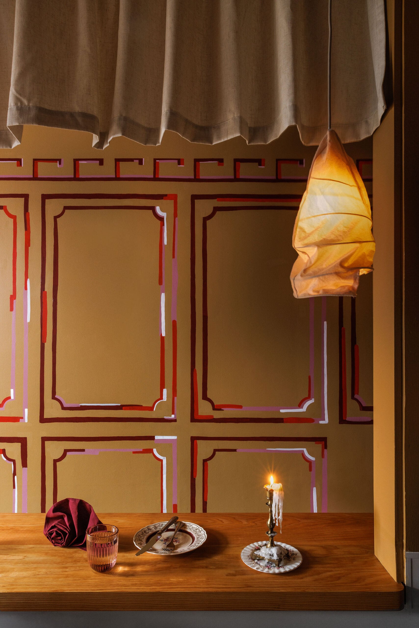 Making the most of a limited materials budget, a graphic trompe l’oeuil wall treatment adds romantic, architectural flair. Saksun borrowed the idea from building façades in Northern Italian cities like Liguria, “where paint is used to emulate the elaborate architectural details of more historically wealthy cities,” she says. The result has a dreamy, whimsical beauty, matched by curtains that evoke wavy sheets of pasta.