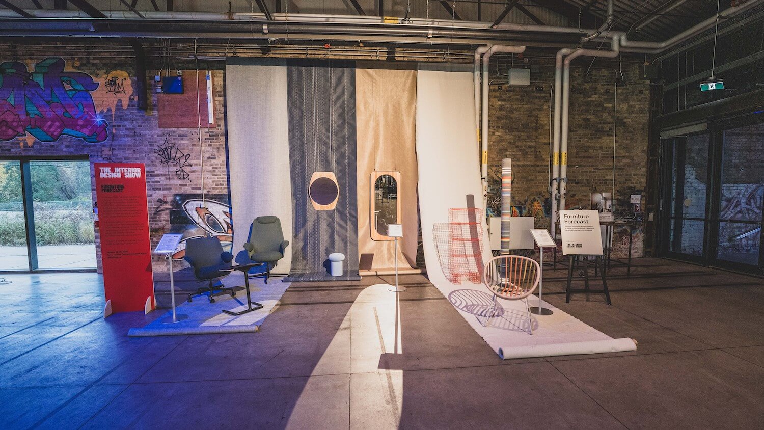 Carnegie’s Xorel fabrics are a backdrop for Pearson Lloyd’s Aarea chairs and Cosi tables (for Teknion), Jake Oliveira’s Tortue and Farfalle mirrors and smallmediumlarge’s Soufflé stool (for Ourse), Lauren Goodman’s Fresh Catch cabinet, Stackabl and Benoist F. Drust’s Night City Scape floor lamp and Dedon’s Kida chair by Stephen Burks.