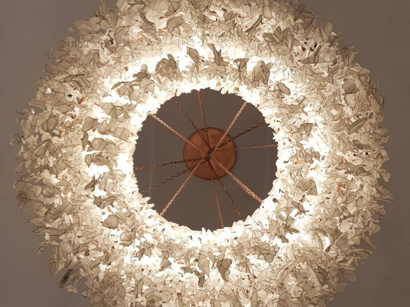 At ICFF, where established Canadian brands Bensen, Molo and ANDlight dominated, Jeff Martin Joinery brought the quirk. His Cymatic Lenses series includes a chandelier composed of blown glass and mandrel-bent steel and a sconce with a textural hand-carved and -painted base.