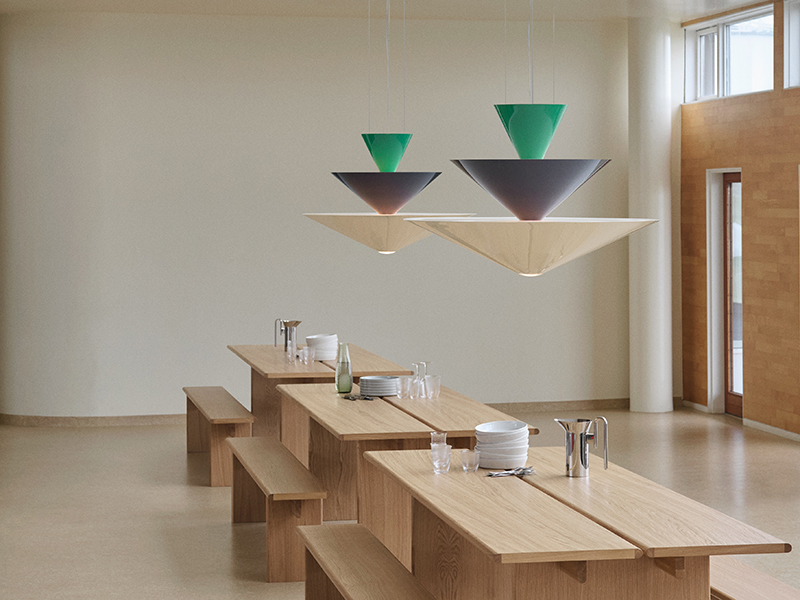 The tiered conical shades cast both an ambient up-light and a focused down-light, and are available in two colour combinations: Signal Green, Deep Blue & Ecru White (shown) and Vermilion Red, Dark Burgundy & Ecru White.