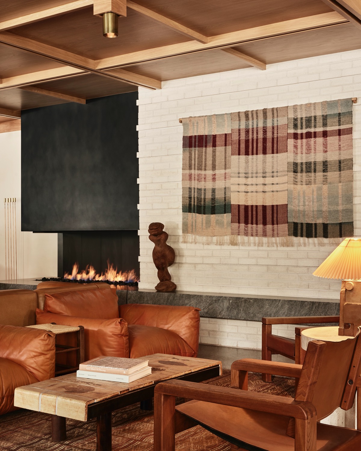 A closeup of one of the gold private rooms in Silencio NYC (a club designed by Crosby Studios and inspired by David Lynch), showing the built-in bench and central circular cocktail table. The room is two steps up from the main dance floor.