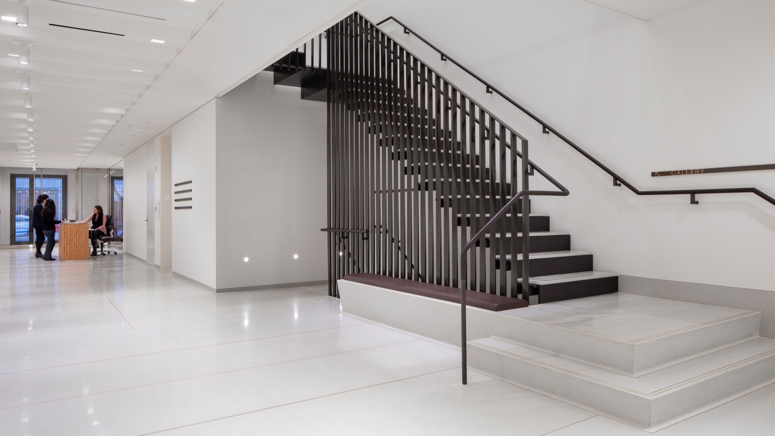 The curvaceous curtain wall is activated by a series of anamorphic cut-outs in the frit pattern. Viewed from specific points at street level, the cut-outs evoke the Center’s logo.